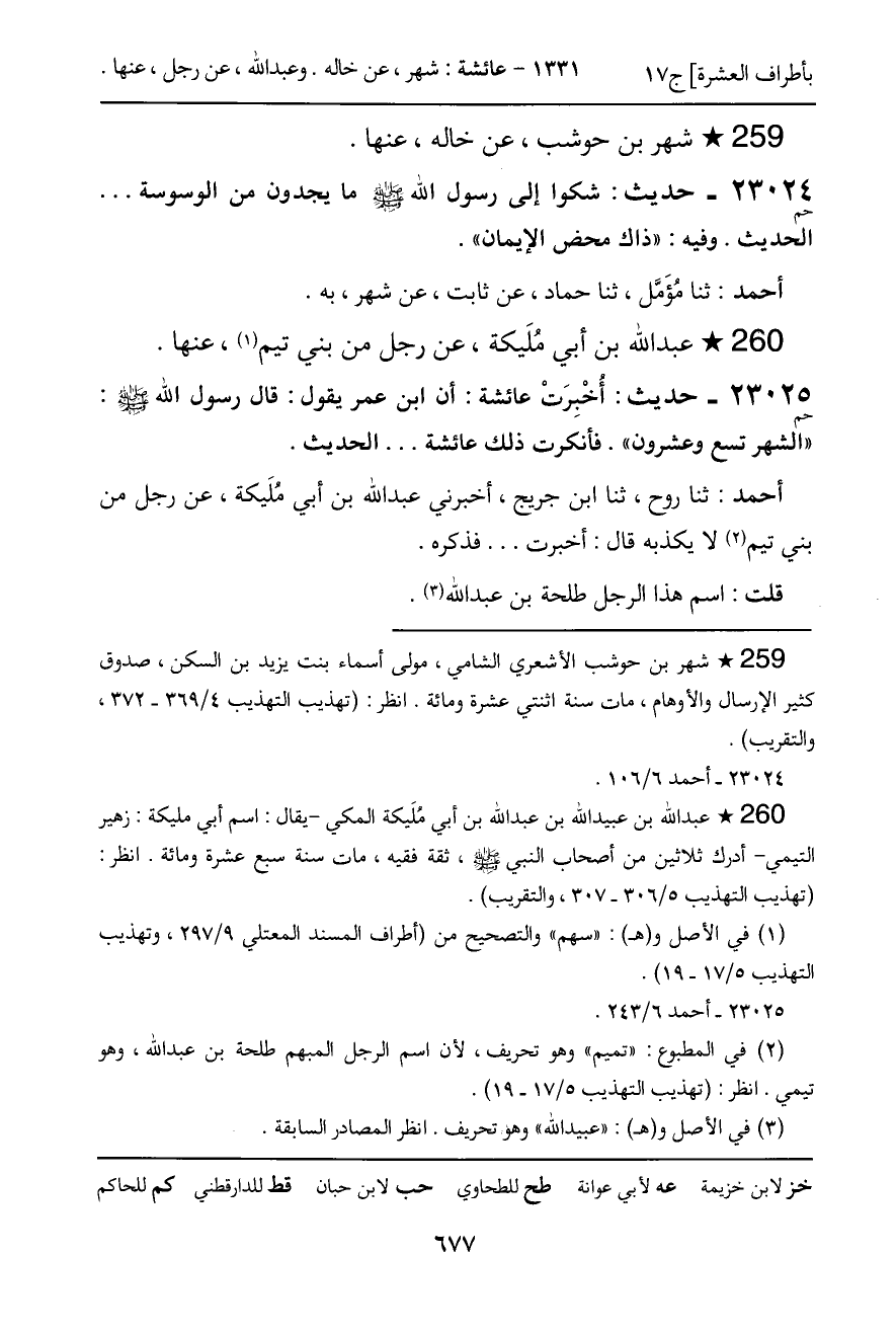 23025 - حديث (حم) : أُخْبِرَتْ عائشة: أن ابن عمر يقول: قال رسول الله - صَلَّى اللَّهُ عَلَيْهِ وَسَلَّمَ -: "الشهر تسع وعشرون". فأنكرت ذلك عائشة ... الحديث.