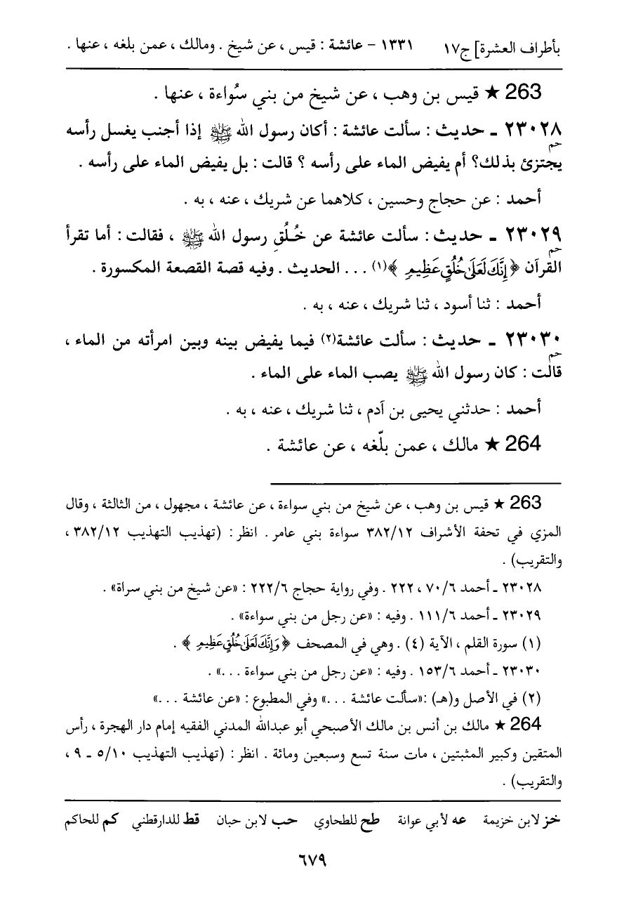 23028 - حديث (حم) : سألت عائشة: أكان رسول الله - صَلَّى اللَّهُ عَلَيْهِ وَسَلَّمَ - إذا أجنب يغسل رأسه يجتزئ بذلك؟ أم يفيض الماء على رأسه؟ قالت: بل يفيض الماء على رأسه.
