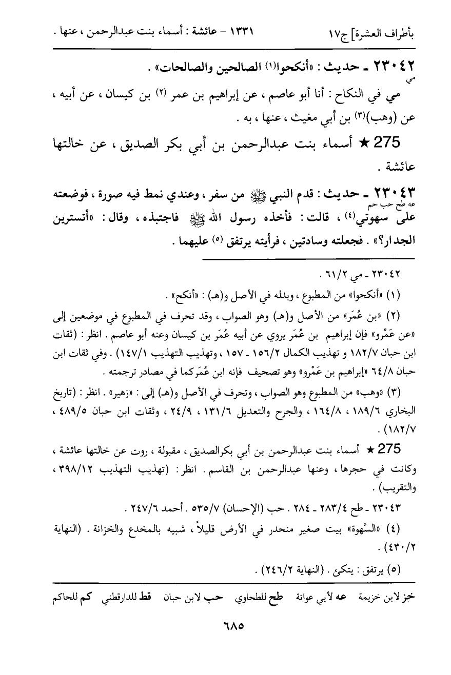 23043 - حديث (عه طح حب حم) : قدم النبي - صَلَّى اللَّهُ عَلَيْهِ وَسَلَّمَ - من سفر، وعندي نمط فيه صورة، فوضعته على سهوتي، قالت: فأخذه رسول الله - صَلَّى اللَّهُ عَلَيْهِ وَسَلَّمَ - فاجتبذه، وقال: "أتسترين الجدار؟ ". فجعلته وسادتين، فرأيته يرتفق عليهما.