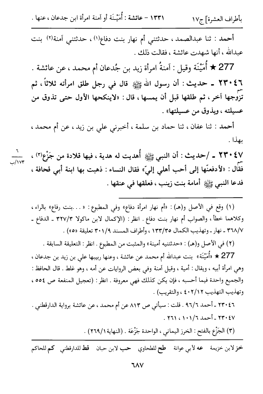 23047 - حديث (حم) : أن النبي - صَلَّى اللَّهُ عَلَيْهِ وَسَلَّمَ - أهديت له هدية، فيها قلادة من جَزْع، فقال: "لأدفعنّها إلى أحب أهلي إليّ" فقال النساء: ذهبت بها ابنة أبي قحافة، فدعا النبي - صَلَّى اللَّهُ عَلَيْهِ وَسَلَّمَ - أمامة بنت زينب، فعلقها في عنقها.