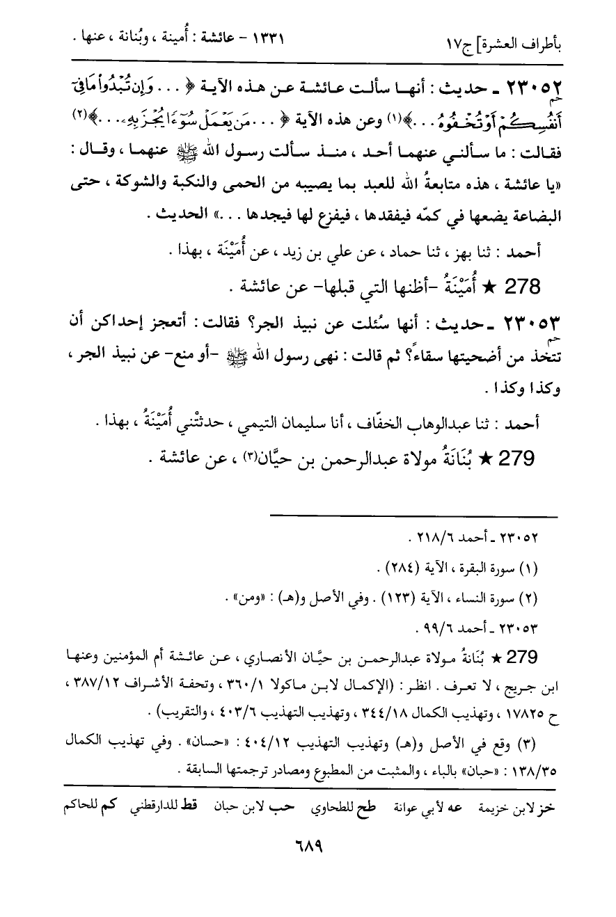 23052 - حديث (حم) : أنها سألت عائشة عن هذه الآية ( ... وَإِنْ تُبْدُوا مَا فِي أَنْفُسِكُمْ أَوْ تُخْفُوهُ ... ) وعن هذه الآية ( ... مَنْ يَعْمَلْ سُوءًا يُجْزَ بِهِ ... ) فقالت: ما سألني عنهما أحد، منذ سألت رسول الله - صَلَّى اللَّهُ عَلَيْهِ وَسَلَّمَ - عنهما، وقال: "يا عائشة، هذه متابعةُ الله للعبد بما يصيبه من الحمى والنكبة والشوكة، حتى البضاعة يضعها في كمّه فيفقدها، فيفزع لها فيجدها ... " الحديث.