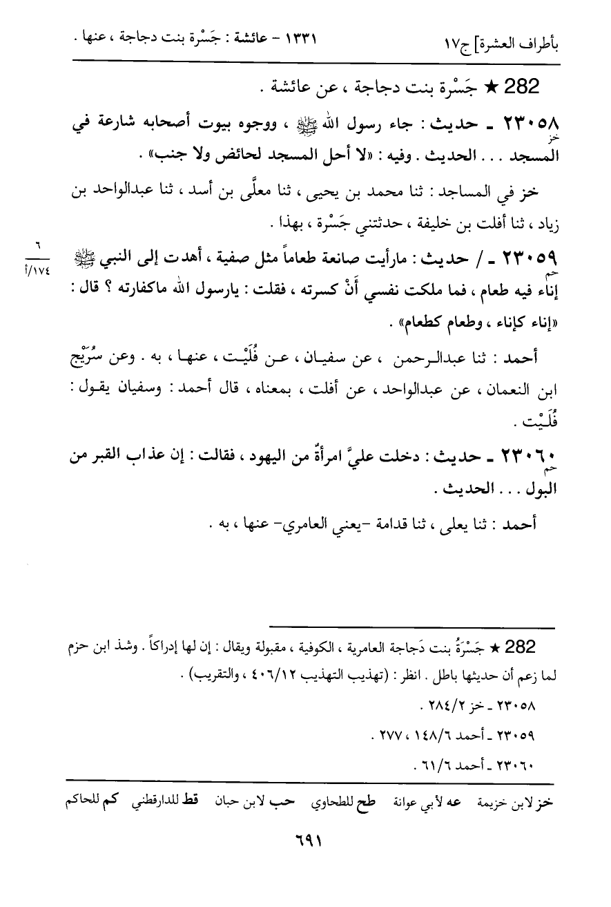 23060 - حديث (حم) : دخلت عليَّ امرأة من اليهود، فقالت: إن عذاب القبر من البول ... " الحديث.