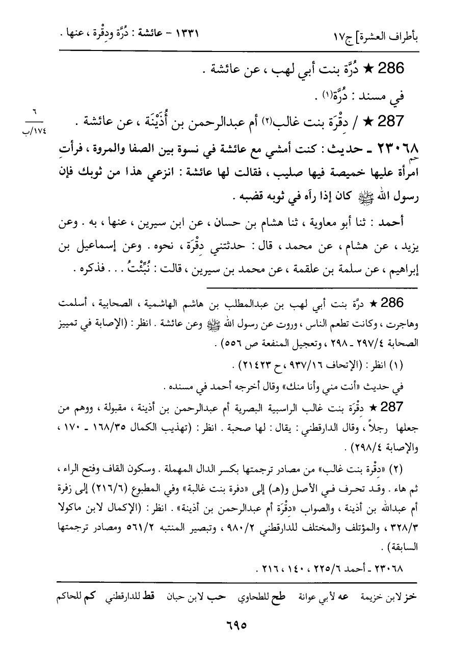 أحمد: ثنا أبو معاوية، ثنا هشام بن حسان، عن ابن سيرين، عنها، به. وعن يزيد، عن هشام، عن محمد، قال: حدثتني دِقْرَة، نحوه. وعن إسماعيل بن إبراهيم، عن سلمة بن علقمة، عن محمد بن سيرين، قالت: نُبئْتُ ... فذكره.