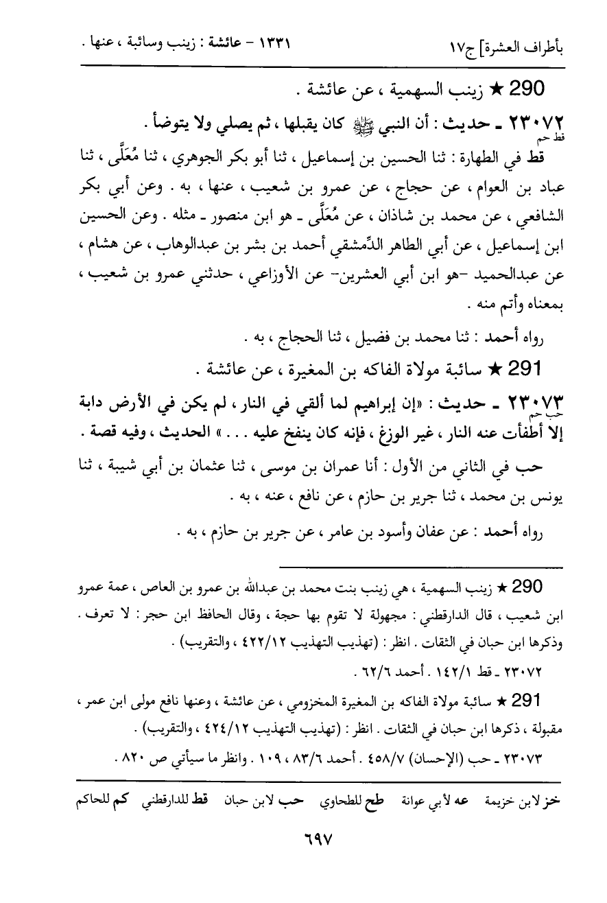 قط في الطهارة: ثنا الحسن بن إسماعيل، ثنا أبو بكر الجوهري، ثنا معَلَّى، ثنا عباد بن العوام، عن حجاج، عن عمرو بن شعيب، عنها، به. وعن أبي بكر الشافعي، عن محمد بن شاذان، عن معَلَّى - هو ابن منصور - مثله. وعن الحسين ابن إسماعيل، عن أبي الطاهر الدمشقي أحمد بن بشر بن عبد الوهاب، عن هشام، عن عبد الحميد - هو ابن أبي العشرين - عن الأوزاعي، حدثني عمرو بن شعيب، بمعناه وأتم منه.