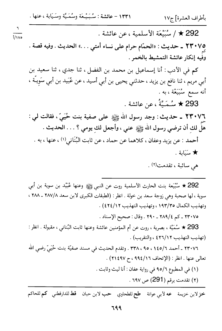 23075 - حديث (كم) : "الحمّام حرام على نساء أمتي ... " الحديث. وفيه قصة.