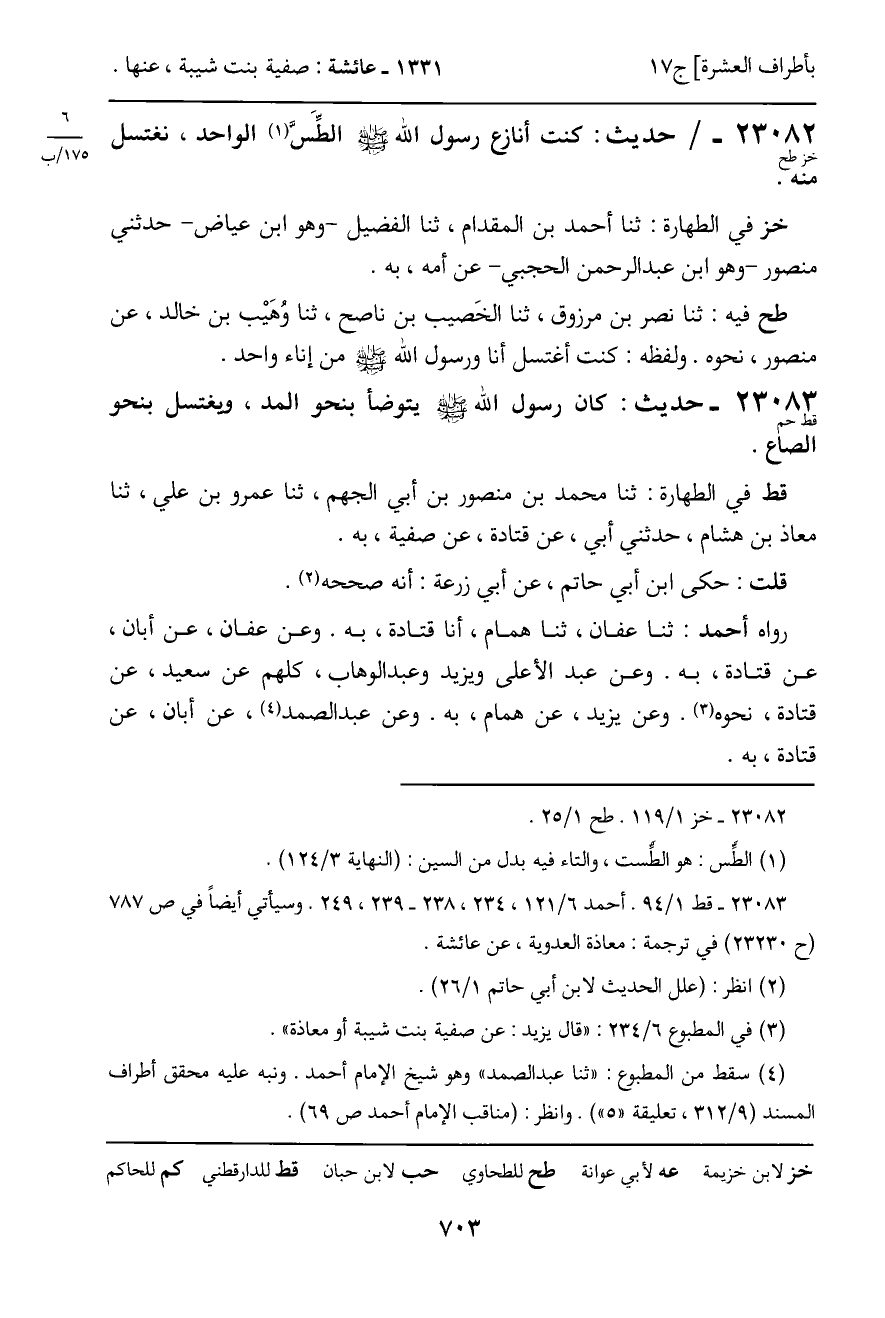 23082 - حديث (خز طح) : كنت أنازع رسول الله - صَلَّى اللَّهُ عَلَيْهِ وَسَلَّمَ - الطِّسَّ الواحد، نغتسل منه.