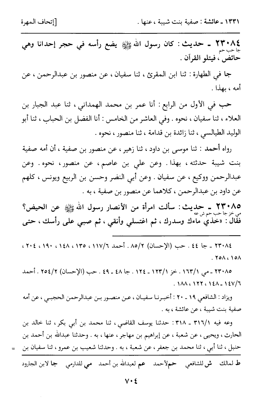 23084 - حديث (جا حب حم) : كان رسول الله - صَلَّى اللَّهُ عَلَيْهِ وَسَلَّمَ - يضع رأسه في حجر إحدانا وهي حائض، فيتلوا القرآن.