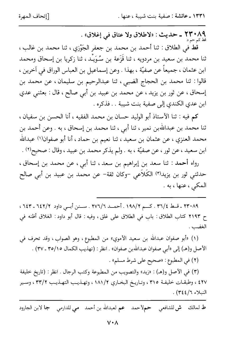 قط في الطلاق: ثنا أحمد بن محمد بن جعفر الجَوزي، ثنا محمد بن غالب، ثنا محمد بن سعيد بن مردويه، ثنا قَزَعة بن سُوَيْد، ثنا زكريا بن إسحاق ومحمد ابن عثمان، جميعاً عن صفيّة، بهذا. وعن إسماعيل بن العباس الوراق في آخرين، قالوا: ثنا محمد بن الحجاج الضبي، ثنا عبد الرحيم بن سليمان، عن محمد بن إسحاق، عن ثور بن يزيد، عن محمد بن عبيد بن أبي صالح، قال: بعثني عدي ابن عدي الكندي إلى صفية بنت شيبة.. فذكره.