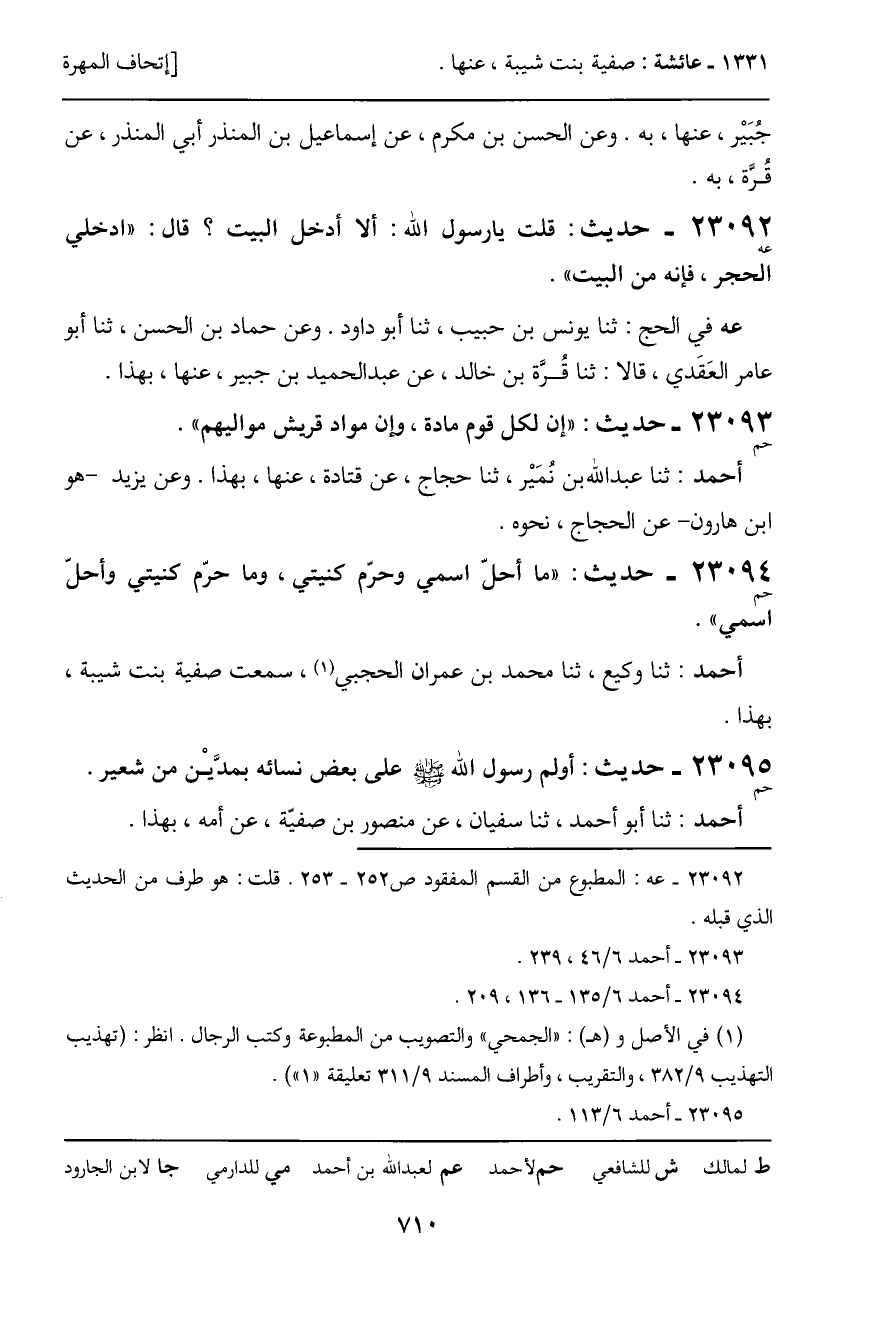 23092 - حديث (عه) : قلت يا رسول الله: ألا أدخل البيت؟ قال: "ادخلي الحجر، فإنه من البيت".