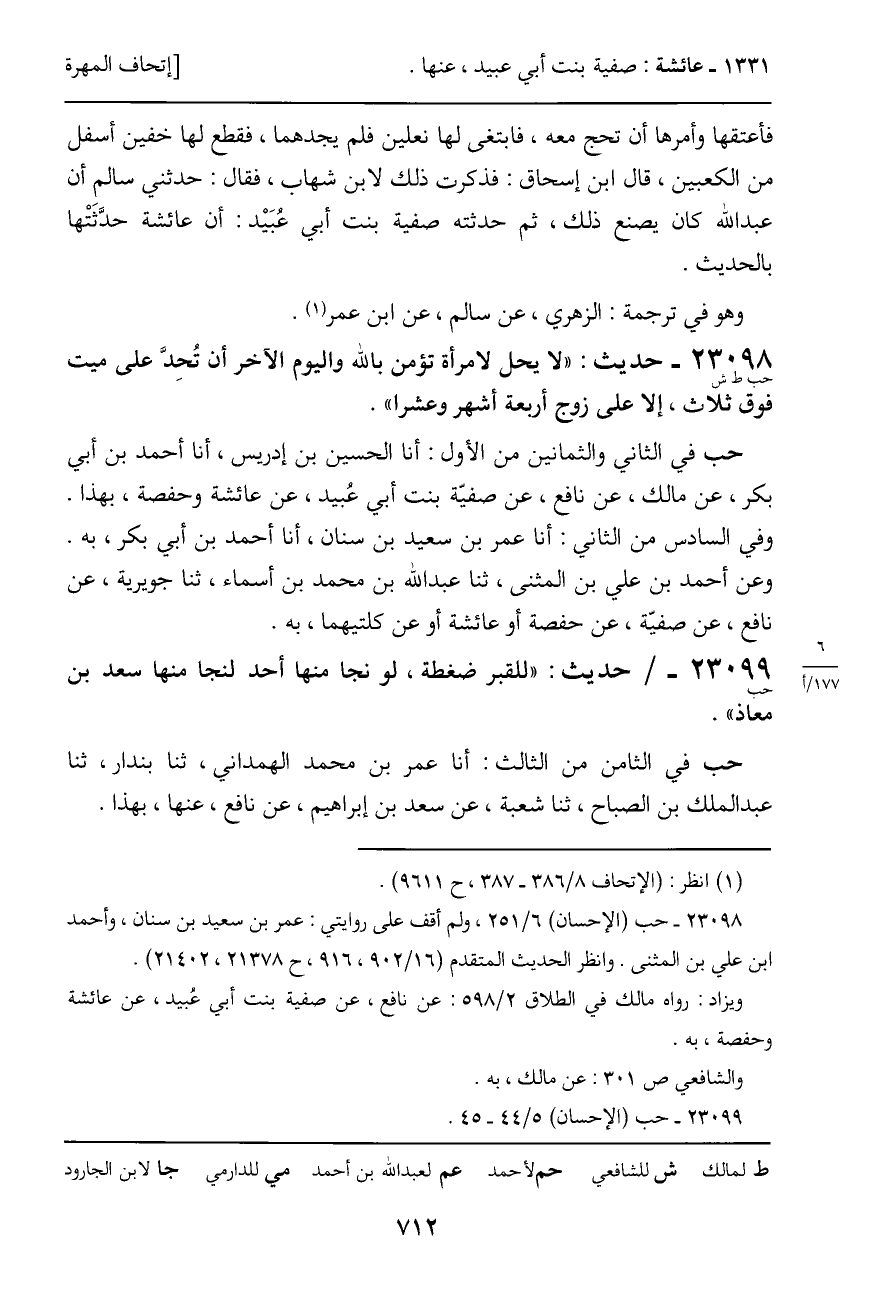 حب في الثاني والثمانين من الأول: أنا الحسين بن إدريس، أنا أحمد بن أبي بكر، عن مالك، عن نافع، عن صفيّة بنت أبي عبيد، عن عائشة وحفصة، بهذا.