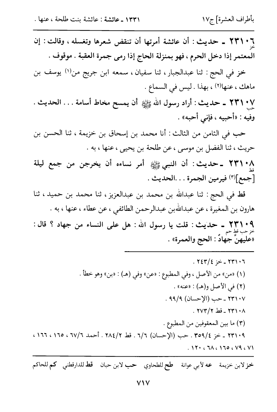 -[718]- خز في الحج: ثنا علي بن المنذر، ثنا ابن فضيل، ثنا حبيب بن أبي عمرة، عن عائشة بنت طلحة، بهذا. ليس في السماع.