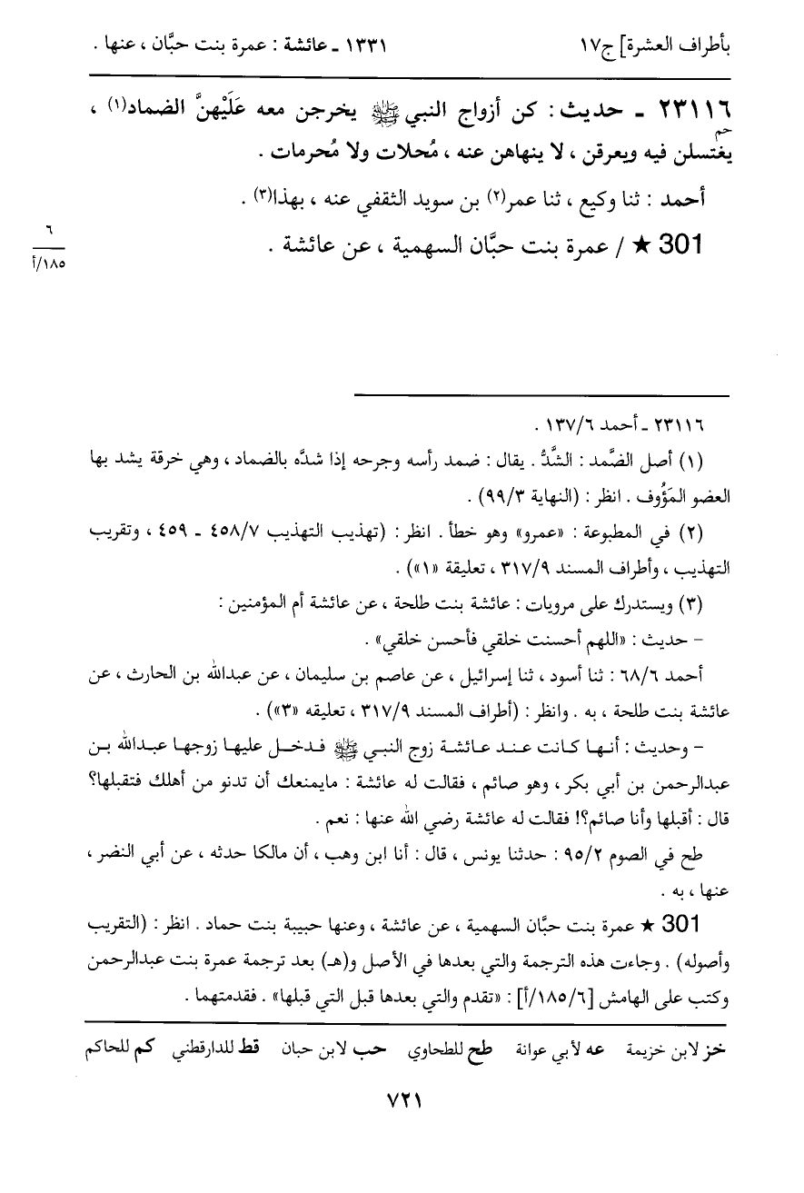 23116 - حديث (حم) : كن أزواج النبي - صَلَّى اللَّهُ عَلَيْهِ وَسَلَّمَ - يخرجن معه عَلَيْهنَّ الضماد، يغتسلن فيه ويعرقن، لا ينهاهن عنه، محلات ولا مُحرمات.