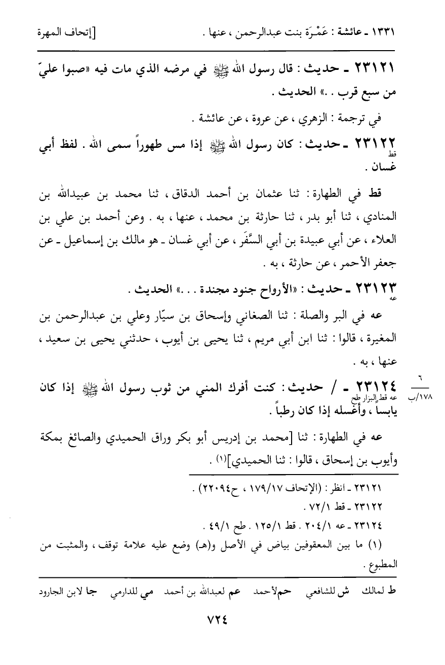 قط في الطهارة: ثنا عثمان بن أحمد الدقاق، ثنا محمد بن عبيد الله بن المنادي، ثنا أبو بدر، ثنا حارثة بن محمد، عنها، به. وعن أحمد بن علي بن العلاء، عن أبي عبيدة بن أبي السَّفَر، عن أبي غسان - هو مالك بن إسماعيل - عن جعفر الأحمر، عن حارثة، به.