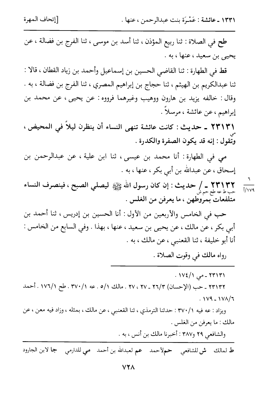 حب في الخامس والأربعين من الأول: أنا الحسين بن إدريس، ثنا أحمد بن أبي بكر، عن مالك، عن يحيى بن سعيد، عنها، بهذا. وفي السابع من الخامس: أنا أبو خليفة، ثنا القعنبي، عن مالك، به.