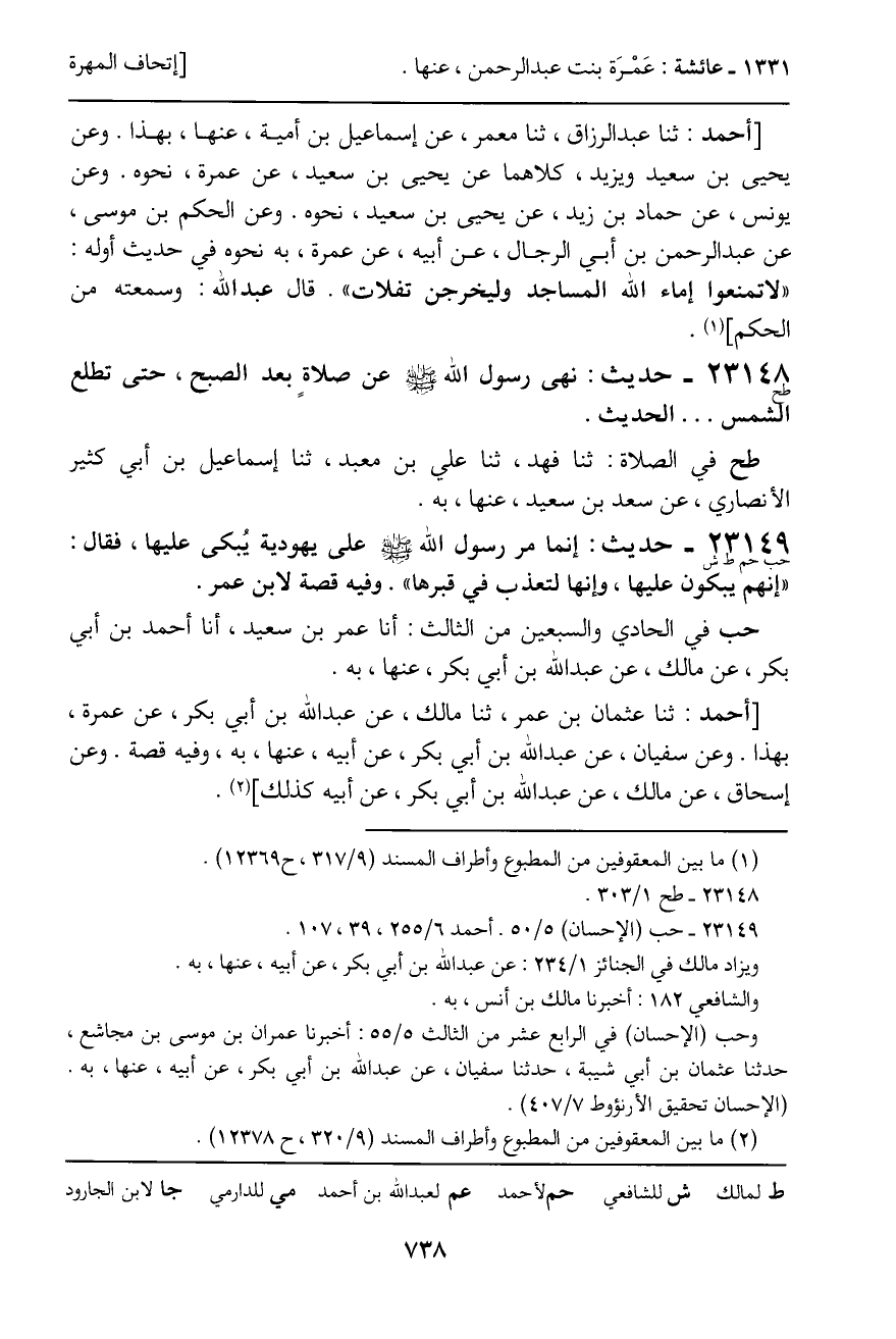 [أحمد: ثنا عثمان بن عمر، ثنا مالك، عن عبد الله بن أبي بكر، عن عمرة، بهذا. وعن سفيان، عن عبد الله بن أبي بكر، عن أبيه، عنها، به، وفيه قصة. وعن إسحاق، عن مالك، عن عبد الله بن أبي بكر، عن أبيه كذلك] .