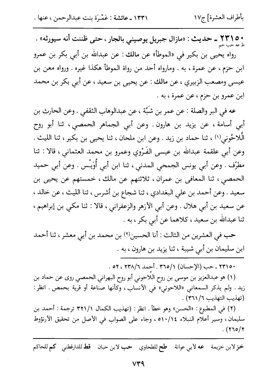 رواه يحيى بن بكير في "الموطأ" عن مالك: عن عبد الله بن أبي بكر بن عمرو ابن حزم، عن عمرة، به. وما رواه أحد من رواة الموطأ هكذا غيره. ورواه معن بن عيسى ومصعب الزبيري، عن مالك: عن يحيى بن سعيد، عن أبي بكر بن محمد ابن عمرو بن حزم، عن عمره، به.