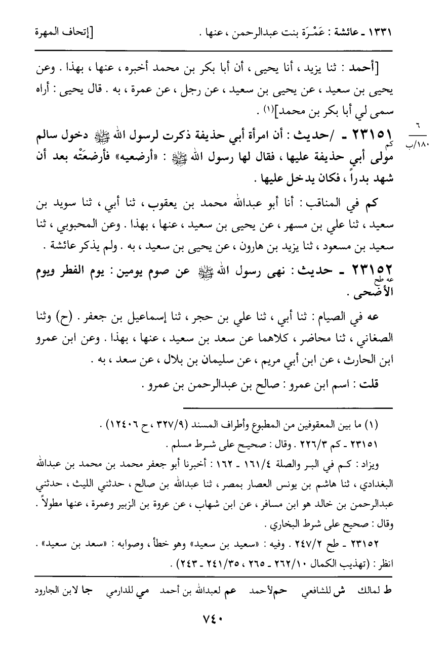 كم في المناقب: أنا أبو عبد الله محمد بن يعقوب، ثنا أبي، ثنا سويد بن سعيد، ثنا علي بن مسهر، عن يحيى بن سعيد، عنها، بهذا. وعن المحبوبي، ثنا سعيد بن مسعود، ثنا يزيد بن هارون، عن يحيى بن سعيد، به ولم يذكر عائشة.