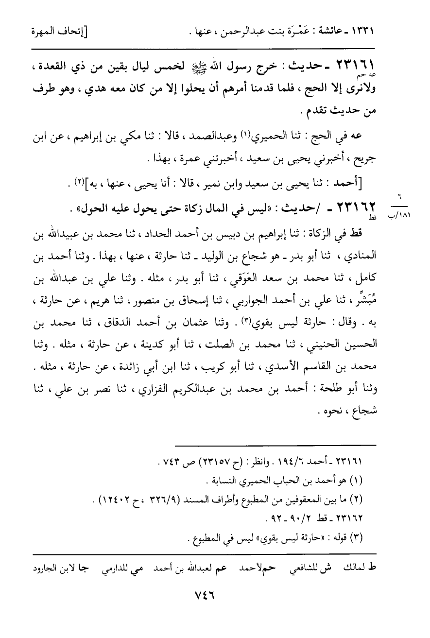 عه في الحج: ثنا الحميري وعبد الصمد، قالا: ثنا مكي بن إبراهيم، عن ابن جريح، أخبرني يحيى بن سعيد، أخبرتني عمرة، بهذا.