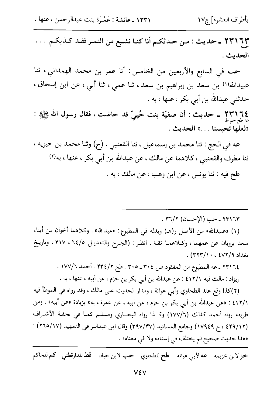 23164 - حديث (عه طح حم ط) : أن صفية بنت حُييّ قد حاضت، فقال رسول الله - صَلَّى اللَّهُ عَلَيْهِ وَسَلَّمَ -: "لعلها تحبسنا ... " الحديث.