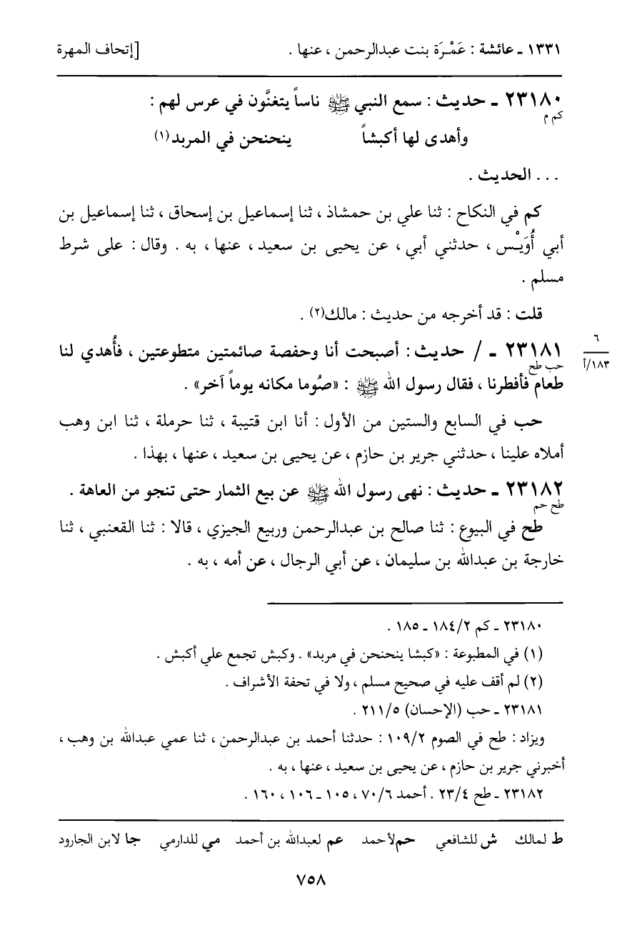 23180 - حديث (كم م) : سمع النبي - صَلَّى اللَّهُ عَلَيْهِ وَسَلَّمَ - ناساً يتغنَّون في عرس لهم: