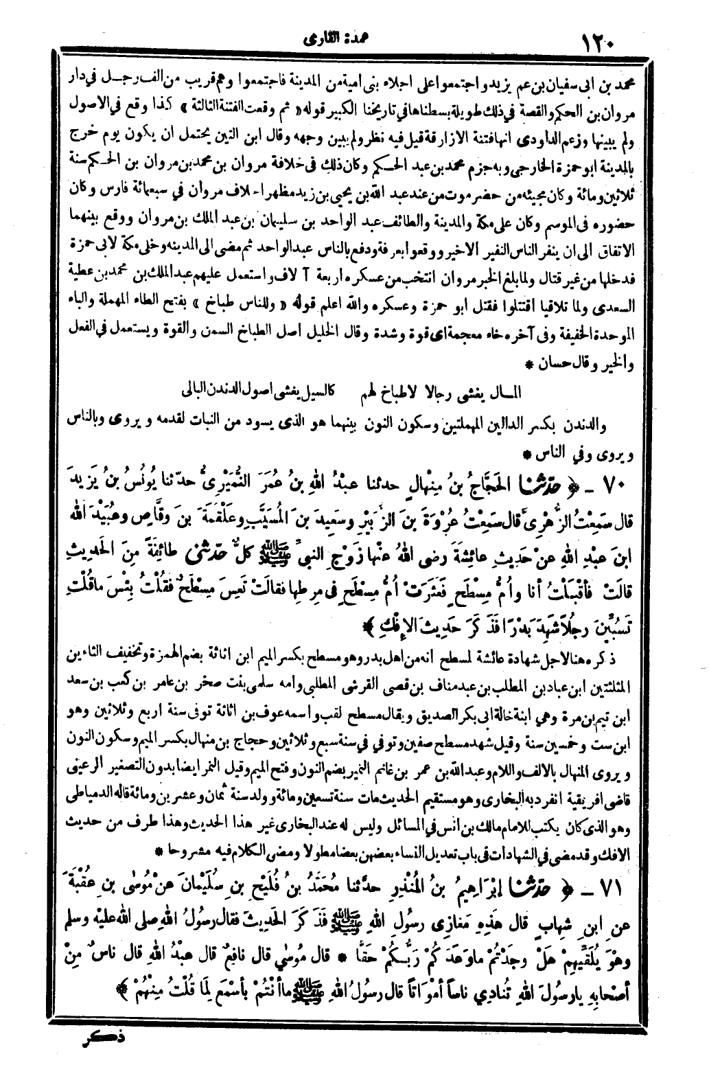 70 - (حَدثنَا حجاج بن منهال حَدثنَا عبد الله بن عمر النميري حَدثنَا يُونُس بن يزِيد قَالَ سَمِعت عُرْوَة بن الزبير وَسَعِيد بن الْمسيب وعلقمة بن وَقاص وَعبيد الله بن عبد الله عَن حَدِيث عَائِشَة رَضِي الله عَنْهَا زوج النَّبِي - صَلَّى اللَّهُ عَلَيْهِ وَسَلَّم َ - كل حَدثنِي طَائِفَة من الحَدِيث قَالَت فَأَقْبَلت أَنا وَأم مسطح فَعَثَرَتْ أم مسطح فِي مرْطهَا فَقَالَت تعس مسطح فَقلت بئس مَا قلت تسبين رجلا شهد بَدْرًا فَذكر حَدِيث الْإِفْك) ذكره هُنَا لأجل شَهَادَة عَائِشَة لمسطح أَنه من أهل بدر وَهُوَ مسطح بِكَسْر الْمِيم ابْن أَثَاثَة بِضَم الْهمزَة وَتَخْفِيف الثائين المثلثتين ابْن عباد بن الْمطلب بن عبد منَاف بن قصي الْقرشِي المطلبي وَأمه سلمى بنت صَخْر بن عَامر بن كَعْب بن سعد ابْن تَمِيم بن مرّة وَهِي ابْنة خَالَة أبي بكر الصّديق وَيُقَال مسطح لقب واسْمه عَوْف ابْن أَثَاثَة توفّي سنة أَربع وَثَلَاثِينَ وَهُوَ ابْن سِتّ وَخمسين سنة وَقيل شهد مسطح صفّين وَتُوفِّي فِي سنة سبع وَثَلَاثِينَ وحجاج بن منهال بِكَسْر الْمِيم وَسُكُون النُّون ويروى الْمنْهَال بِالْألف وَاللَّام وَعبد الله بن عمر بن غَانِم النمير بِضَم النُّون وَفتح الْمِيم وَقيل النمر أَيْضا بِدُونِ التصغير الرعيني قَاضِي إفريقيا انْفَرد بِهِ البُخَارِيّ وَهُوَ مُسْتَقِيم الحَدِيث مَاتَ سنة تسعين وَمِائَة وَولد سنة ثَمَان وَعشْرين وَمِائَة قَالَه الدمياطي وَهُوَ الَّذِي كَانَ يكْتب للْإِمَام مَالك بن أنس فِي الْمسَائِل وَلَيْسَ لَهُ عِنْد البُخَارِيّ غير هَذَا الحَدِيث وَهَذَا طرف من حَدِيث الْإِفْك وَقد مضى فِي الشَّهَادَات فِي بَاب تَعْدِيل النِّسَاء بَعضهنَّ بَعْضًا مطولا وَمضى الْكَلَام فِيهِ مشروحاً