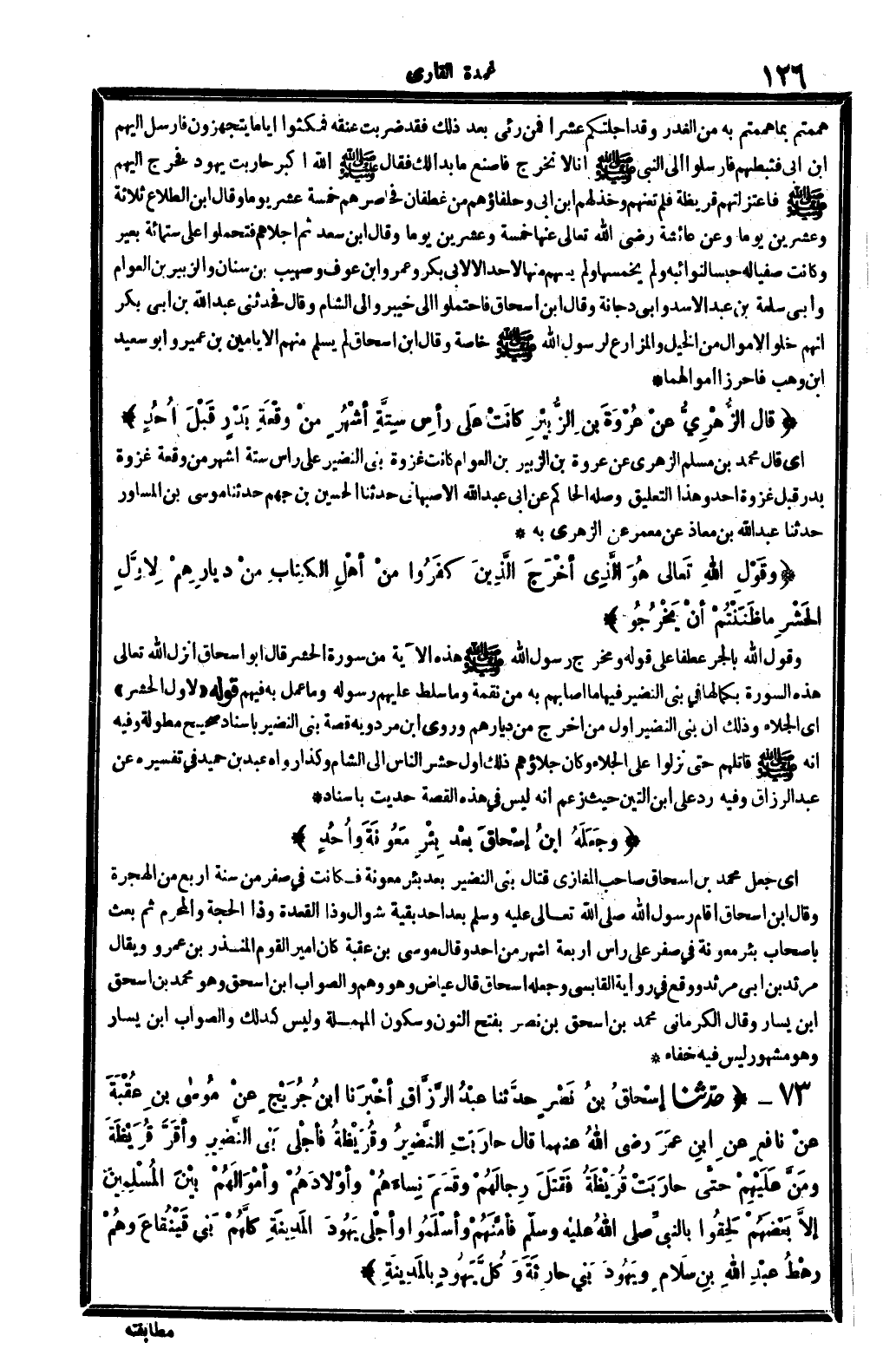 قَالَ الزُّهْرِيُّ عنْ عُرْوَةَ بنِ الزُّبَيْرِ كانَتْ عَلَى رأسِ سِتَّةِ أشْهُرٍ مِنْ وَقْعَةِ بَدْرٍ قَبْلَ أحُدٍ أَي: قَالَ مُحَمَّد بن مُسلم الزُّهْرِيّ عَن عُرْوَة بن الزبير بن الْعَوام: كَانَت غَزْوَة بني النَّضِير على رَأس سِتَّة أشهر من وقْعَة غَزْوَة بدر قبل غَزْوَة أحد، وَهَذَا التَّعْلِيق وَصله الْحَاكِم عَن أبي عبد الله الْأَصْبَهَانِيّ: حَدثنَا الْحُسَيْن بن جهم حَدثنَا مُوسَى بن الْمسَاوِر حَدثنَا عبد الله بن معَاذ عَن معمر عَن الزُّهْرِيّ بِهِ.
