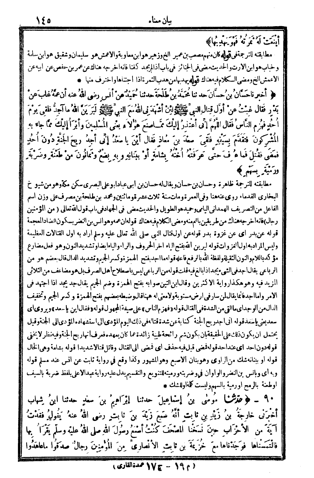 قَوْله: (أَن عَمه) وَهُوَ أنس بن النَّضر بِسُكُون الضَّاد الْمُعْجَمَة، قَوْله: (عَن بدر) أَي: عَن غَزْوَة بدر. قَوْله: (عَن أول قتال النَّبِي صلى الله عَلَيْهِ وَسلم) أَرَادَ بِهِ: أول القتالات الْعَظِيمَة وَلَيْسَ المُرَاد بِهِ أول الْغَزَوَات. قَوْله: (ليرين الله) بِفَتْح الْيَاء آخر الْحُرُوف وَالرَّاء وَالْيَاء أَيْضا وَتَشْديد النُّون، وَهُوَ فعل مضارع مُؤَكد بِاللَّامِ وَالنُّون الثَّقِيلَة، وَلَفْظَة: الله، بِالرَّفْع فَاعله. قَوْله: (مَا أجد) بِفَتْح الْهمزَة وَكسر الْجِيم وَتَشْديد الدَّال. قَالَ بَعضهم: هُوَ من الرباعي، يُقَال: أجد فِي الشَّيْء يجد إِذا بَالغ فِيهِ. قلت: قَوْله: من الرباعي، لَيْسَ باصطلاح أهل الصّرْف، بل هُوَ مضاعف من الثلاثي الْمَزِيد فِيهِ، وَهُوَ هَكَذَا رِوَايَة الْأَكْثَرين، وَقَالَ ابْن التِّين: صَوَابه بِفَتْح الْهمزَة وَضم الْجِيم، يُقَال: جد يجد إِذا اجْتهد فِي الْأَمر، وَأما أجد، فَإِنَّمَا يُقَال لمن سَار فِي أَرض مستوية، وَلَا معنى لَهُ هَهُنَا. قَالَ: وَضَبطه بَعضهم بِفَتْح الْهمزَة وَكسر الْجِيم وَتَخْفِيف الدَّال من: الوجد، أَي: مَا ألْقى من الشدَّة فِي الْقِتَال. قَوْله: (فَهزمَ النَّاس) على صِيغَة الْمَجْهُول. قَوْله: (فَقَالَ: أَيْن يَا سعد) ويروى: أَي سعد، يَعْنِي: يَا سعد. قَوْله: (إِنِّي أجد ريح الْجنَّة) كِنَايَة عَن شدَّة قِتَاله فِي ذَلِك الْيَوْم الْمُؤَدِّي إِلَى استشهاده الْمُؤَدِّي إِلَى الْجنَّة. وَقيل: يحْتَمل أَن يكون ذَلِك على الْحَقِيقَة بِأَن يكون شم رَائِحَة طيبَة زَائِدَة عَمَّا كَانَ يعهده، فَعرف أَنَّهَا ريح الْجنَّة، وَفِيه نظر لَا يخفى. قَوْله: (دون أحد) أَي: عِنْد أحد. قَوْله: (فَمضى) قيل: فِيهِ حدف أَي: فَمضى إِلَى الْقِتَال وَقَاتل قتالاً شَدِيدا. قَوْله: (بشامة) وَهِي الْخَال. قَوْله: (أَو ببنانه) شكّ من الرَّاوِي وَهُوَ بنان الْأصْبع وَهُوَ الْمَشْهُور، وَكَذَا وَقع فِي رِوَايَة ثَابت عَن أنس عِنْد مُسلم. قَوْله: (وَبِه) أَي: وبأنس بن النَّضر، والواوان فِي: وضربته ورميته، للتنويع والتقسيم يدل عَلَيْهِ رِوَايَة عبد الْأَعْلَى بِلَفْظ: ضَرْبَة بِالسَّيْفِ أَو طعنة بِالرُّمْحِ أَو رمية بِالسَّهْمِ، وَلَيْسَت كلمة: أَو، للشَّكّ.