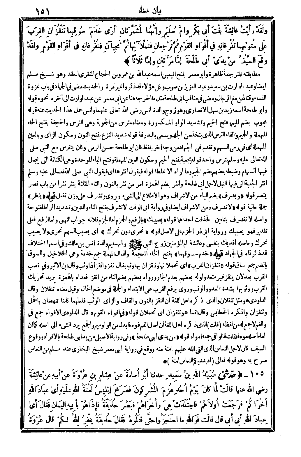وَلَقَد رَأَيْت عَائِشَة بنت أبي بكر وَأم سليم وإنهما لمشمرتان أرى خدم سوقهما تنقزان الْقرب على متونهما تفرغانه فِي أَفْوَاه الْقَوْم ثمَّ تَرْجِعَانِ فتملآنها ثمَّ تجيآن فتفرغانه فِي أَفْوَاه الْقَوْم وَلَقَد وَقع السَّيْف من يَدي أبي طَلْحَة إِمَّا مرَّتَيْنِ وَإِمَّا ثَلَاثًا) مطابقته للتَّرْجَمَة ظَاهِرَة وَأَبُو معمر بِفَتْح الميمين اسْمه عبد الله بن عَمْرو بن الْحجَّاج الْمنْقري المعقد وَهُوَ شيخ مُسلم أَيْضا وَعبد الْوَارِث بن سعيد وَعبد الْعَزِيز بن صُهَيْب وكل هَؤُلَاءِ قد ذكرُوا غيرَة مرّة والْحَدِيث مضى فِي الْجِهَاد فِي بَاب غَزْوَة النِّسَاء وقتالهن مَعَ الرِّجَال وَمضى فِي مَنَاقِب أبي طَلْحَة مثل مَا أخرجه هُنَا عَن أبي معمر عَن عبد الْوَارِث إِلَى آخِره نَحوه قَوْله وَأَبُو طَلْحَة اسْمه زيد بن سهل الْأنْصَارِيّ وَهُوَ زوج وَالِدَة أنس رَضِي الله تَعَالَى عَنْهُمَا وَأنس حمل هَذَا الحَدِيث عَنهُ قَوْله مجوب بِضَم الْمِيم وَفتح الْجِيم وَتَشْديد الْوَاو الْمَكْسُورَة وَمَعْنَاهُ مترس من الجوبة وَهِي الترس والحجفة بِفَتْح الْحَاء الْمُهْملَة وَالْجِيم وَالْفَاء الترس الَّذِي يتَّخذ من الْجلد وَيُسمى بالبدرقة قَوْله شَدِيد النزع بِفَتْح النُّون وَسُكُون الزَّاي وبالعين الْمُهْملَة أَي فِي رمي السهْم وَتقدم فِي الْجِهَاد من وَجه آخر بِلَفْظ كَانَ أَبُو طَلْحَة حسن الرَّمْي وَكَانَ يتترس مَعَ النَّبِي - صَلَّى اللَّهُ عَلَيْهِ وَسَلَّم َ - بترس وَاحِد قَوْله بجعبة بِفَتْح الْجِيم وَسُكُون الْعين الْمُهْملَة وَفتح الْبَاء الْمُوَحدَة وَهِي الكنانة الَّتِي يَجْعَل فِيهَا السِّهَام وَضَبطه بَعضهم بِضَم الْجِيم وَمَا أرَاهُ إِلَّا غَلطا قَوْله فَيَقُول انثرها أَي فَيَقُول النَّبِي - صَلَّى اللَّهُ عَلَيْهِ وَسَلَّم َ - انثر الجعبة الَّتِي فِيهَا النبل لأجل أبي طَلْحَة وانثر بِضَم الْهمزَة أَمر من نثر بالنُّون والثاء الْمُثَلَّثَة ينثر نثرا من بَاب نصر ينصر قَوْله " ويشرف " بِضَم الْيَاء من الإشراف وَهُوَ الِاطِّلَاع إِلَى الشَّيْء ويروى وتشرف على وزن تفعل قَوْله " ينظر " جملَة حَالية قَوْله " لَا تشرف " من الإشراف أَيْضا وَفِي رِوَايَة أبي الْوَقْت لَا تشرف بِفَتْح التَّاء والشين وَتَشْديد الرَّاء الْمَفْتُوحَة وَأَصله لَا تتشرف بتاءين فحذفت إِحْدَاهمَا قَوْله " يصيبك " بِالرَّفْع والجزم أما الْجَزْم فَلِأَنَّهُ جَوَاب النَّهْي وَأما الرّفْع فعلى تَقْدِير فَهُوَ يصيبك وَرِوَايَة أبي ذَر الْجَزْم على الأَصْل قَوْله " نحري دون نحرك " أَي يُصِيب السهْم نحري وَلَا يُصِيب نحرك وَحَاصِله أفديك بنفسي وَعَائِشَة أم الْمُؤمنِينَ زوج النَّبِي - صَلَّى اللَّهُ عَلَيْهِ وَسَلَّم َ - وَأم سليم وَالِدَة أنس بن مَالك وَفِي اسْمهَا اخْتِلَاف قد ذَكرْنَاهُ فِي الْجِهَاد قَوْله " خدم سوقهما " بِفَتْح الْخَاء الْمُعْجَمَة وَالدَّال الْمُهْملَة جمع خدمَة وَهِي الخلاخيل والسوق بِالضَّمِّ جمع سَاق قَوْله " تنقزان الْقرب " أَي تحملانها وتنقزان بهَا وثبا يُقَال نقز وأنقز إِذا وثب وَقَالَ ابْن الْأَثِير وَفِي نصب الْقرب بعد لِأَن ينقز غير مُتَعَدٍّ وأوله بَعضهم بِعَدَمِ الْجَار وَرَوَاهُ بَعضهم بِضَم التَّاء من أنقز فعداه بِالْهَمْزَةِ يُرِيد تَحْرِيك الْقرب ووثوبها بِشدَّة الْعَدو والوثب وَرُوِيَ بِرَفْع الْقرب على الِابْتِدَاء وَالْجُمْلَة فِي مَوضِع الْحَال وَقيل مَعْنَاهُ تنقلان وَقَالَ الدَّاودِيّ هُوَ مثل تنقلان وَالَّذِي ذكره أهل اللُّغَة أَن النقز بالنُّون وَالْقَاف وَالزَّاي الوثب فلعلهما كَانَتَا تنهضان بِالْحملِ وتنقزان وَأنْكرهُ الْخطابِيّ وَقَالَ إِنَّمَا هُوَ تنقزان أَي تحملان قَوْله " فِي أَفْوَاه الْقَوْم " قَالَ الدَّاودِيّ الأفواه جمع فِي والفم لَا جمع لَهُ من لَفظه (قلت) الَّذِي ذكره أهل اللُّغَة 