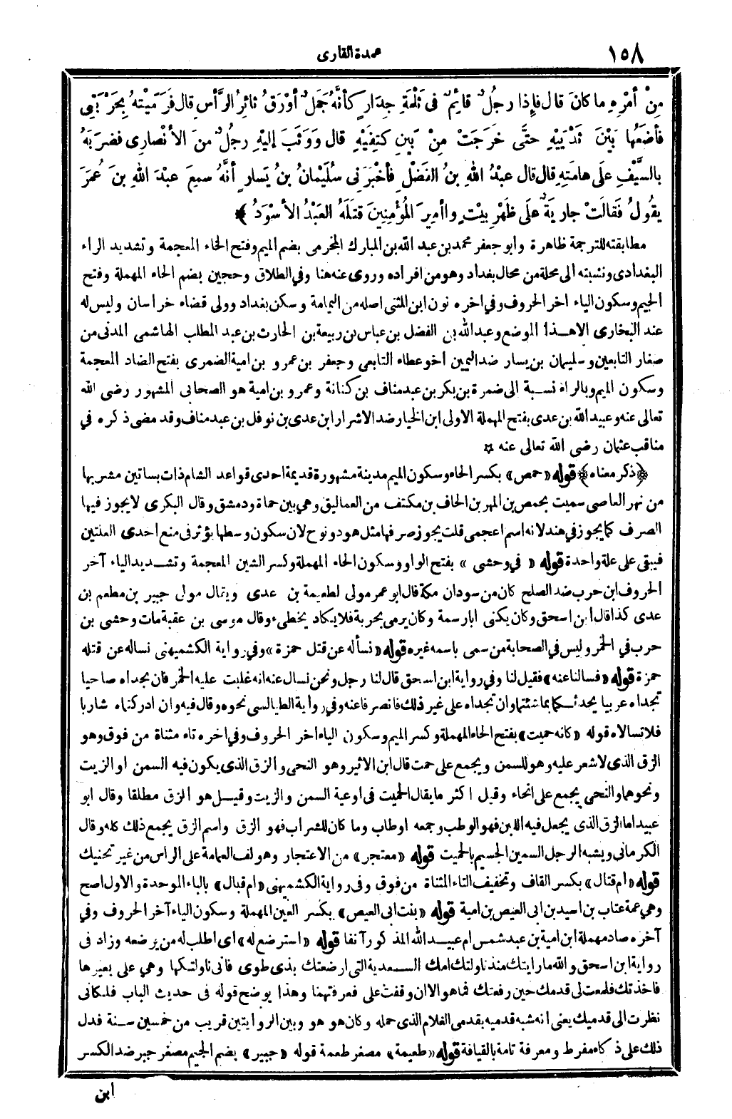 ذكر مَعْنَاهُ: قَوْله: (حمص) ، بِكَسْر الْحَاء وَسُكُون الْمِيم: مَدِينَة مَشْهُورَة قديمَة إِحْدَى قَوَاعِد الشَّام ذَات بساتين، مشربها من نهر العَاصِي، سميت بحمص بن الْمهْر بن ألحاف بن مكتف من العماليق، وَهِي بَين حماة ودمشق، وَقَالَ الْبكْرِيّ: لَا يجوز فِيهَا الصّرْف كَمَا يجوز فِي هِنْد لِأَنَّهُ اسْم أعجمي. قلت: يجوز صرفهَا مثل: هود ونوح، لِأَن سُكُون وَسطهَا يُؤثر فِي منع إِحْدَى العلتين فَيبقى على عِلّة وَاحِدَة. قَوْله: (فِي وَحشِي) ، بِفَتْح الْوَاو وَسُكُون الْحَاء الْمُهْملَة وَكسر الشين الْمُعْجَمَة وَتَشْديد الْيَاء آخر الْحُرُوف: ابْن حَرْب ضد الصُّلْح كَانَ من سودان مَكَّة، قَالَ أَبُو عمر: مولى لطعيمة بن عدي، وَيُقَال: مولى جُبَير بن مطعم بن عدي، كَذَا قَالَ ابْن إِسْحَاق، وَكَانَ يكنى أَبَا رسمة، وَكَانَ يَرْمِي بِحَرْبَة فَلَا يكَاد يخطىء، وَقَالَ مُوسَى بن عقبَة: مَاتَ وَحشِي بن حَرْب فِي الْخمر وَلَيْسَ فِي الصَّحَابَة من سمي باسمه غَيره. قَوْله: (نَسْأَلهُ عَن قتل حَمْزَة) ، وَفِي رِوَايَة الْكشميهني: نَسْأَلهُ عَن قَتله حَمْزَة. قَوْله: (فسألنا عَنهُ فَقيل لنا) وَفِي رِوَايَة ابْن إِسْحَاق: قَالَ لنا رجل وَنحن نسْأَل عَنهُ: إِنَّه غلبت عَلَيْهِ الْخمر، فَإِن تجداه صَاحِيًا تجداه عَرَبيا يحدثكما بِمَا شئتما، وَإِن تجداه على غير ذَلِك، فانصرفا عَنهُ، وَفِي رِوَايَة الطَّيَالِسِيّ نَحوه، وَقَالَ فِيهِ: وَإِن أدركتماه شارباً فَلَا تسألاه. قَوْله: (كَأَنَّهُ حميت) بِفَتْح الْحَاء الْمُهْملَة وَكسر الْمِيم وَسُكُون الْيَاء آخر الْحُرُوف وَفِي آخِره تَاء مثناة من فَوق، وَهُوَ الزق الَّذِي لَا شعر عَلَيْهِ، وَهُوَ للسمن، وَيجمع على: حمت، قَالَ ابْن الْأَثِير: وَهُوَ النحي والزق الَّذِي يكون فِيهِ السّمن أَو الزَّيْت وَنَحْوهمَا، والنحي يجمع على أنحاء، وَقيل: أَكثر مَا يُقَال: الحميت، فِي أوعية السّمن وَالزَّيْت، وَقيل: هُوَ الزق مُطلقًا، وَقَالَ أَبُو عبيد: أما الزق الَّذِي يَجْعَل فِيهِ اللَّبن فَهُوَ الوطب، وَجمعه أوطاب، وَمَا كَانَ للشراب فَهُوَ الزق، وَاسم الزق يجمع ذَلِك كُله، وَقَالَ الْكرْمَانِي: وَيُشبه الرجل السمين الجسيم بالحميت. قَوْله: (معتجر) ، من الاعتجار وَهُوَ لف الْعِمَامَة على الرَّأْس من غير تحنيك. قَوْله: (أم قتال) ، بِكَسْر الْقَاف وَتَخْفِيف التَّاء الْمُثَنَّاة من فَوق، وَفِي رِوَايَة الْكشميهني: (أم قبال) ، بِالْبَاء الْمُوَحدَة، وَالْأول أصح، وَهِي عمَّة عتاب بن أسيد بن أبي الْعيص بن أُميَّة. قَوْله: (بنت أبي الْعيص) ، بِكَسْر الْعين الْمُهْملَة وَسُكُون الْيَاء آخر الْحُرُوف وَفِي آخِره صَاد مُهْملَة: ابْن أُميَّة بن عبد شمس، أم عبيد الله الْمَذْكُور آنِفا. قَوْله: أسترضع لَهُ) أَي: اطلب لَهُ من يرضعه، وَزَاد فِي رِوَايَة ابْن إِسْحَاق: وَالله مَا رَأَيْتُك مُنْذُ ناولتك أمك السعدية الَّتِي أَرْضَعتك بِذِي طوى، فَإِنِّي ناولتكها وَهِي على بَعِيرهَا فأخذتك، فلمعت لي قدمك حِين رفعتك، فَمَا هُوَ إلاَّ أَن وقفت عَليّ فعرفتهما، وَهَذَا يُوضح قَوْله فِي حَدِيث الْبَاب: فلكأني نظرت إِلَى قَدَمَيْك، يَعْنِي أَنه شبه قَدَمَيْهِ بقدمي الْغُلَام الَّذِي حمله، وَكَانَ هُوَ هُوَ، وَبَين الرِّوَايَتَيْنِ قريب من خمسين سنة، فَدلَّ ذَلِك على ذكاء مفرط وَمَعْرِفَة تَامَّة بالقيافة. قَوْله: (طعيمة) ، مصغر: طعمة، قَوْله: (جُبَير) ، بِضَم الْجِيم مصغر: جبر ضد الْكسر