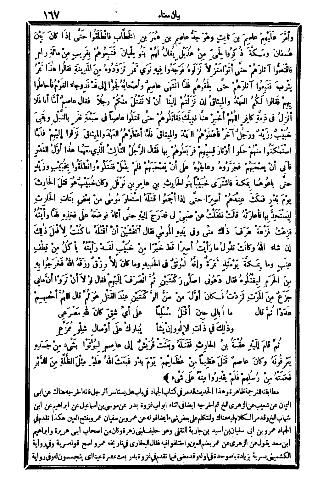 وأمَّرَ عَلَيْهِمْ عاصِمَ بنَ ثَابِتٍ وَهْوَ جَدُّ عَاصِمِ بنِ عُمَرَ بنِ الخَطَّابِ فانْطَلَقُوا حَتَّى إذَا كانَ بَيْنَ عُسْفَانَ ومَكَّةَ ذُكِرُوا لِحَيٍّ مِنْ هُذَيْلٍ يُقَالُ لَهُمْ بَنُو لِحْيَانَ فتَبِعُوهُمْ بِقَرِيبٍ مِنْ مَائَةِ رَامٍ فاقْتَصُّوا آثَارَهُمْ حَتَّى أتَوْا مَنْزِلاً نَزَلُوهُ فوَجَدُوا فِيهِ نَوَي تَمْرٍ تَزَوَّدُوهُ مِنَ المَدِينَةِ فقالُوا هاذا تَمْرُ يَثْرِبَ فتَبِعُوا آثَارَهُمْ حتَّى لَحِقُوهُمْ فلَمَّا انْتَهَى عاصِمٌ وأصْحَابَهُ لَجؤُا إِلَى فَدْفَدٍ وجاءَ القَوْمُ فأحَاطُوا بِهِمْ فَقالُوا لَكُمُ العَهْدُ والمِيثَاقُ إنْ نَزَلْتُمْ إلَيْنَا أنْ لاَ نَقْتُلَ مِنْكُمْ رَجُلاً فَقَالَ عاصِمٌ أمَّا أنَا فَلا أنْزِلُ فِي ذِمَّةِ كافِرٍ أللَّهُمَّ أخْبِرْ عَنَّا نَبِيَّكَ فَقاتَلُوهُمْ حتَّى قَتَلُوا عاصِمَاً فِي سَبْعَةِ نَفَرٍ بالنَّبْلِ وبَقِيَ خُبَيْبٌ وزَيْدٌ ورَجُلٌ آخَرُ فأعْطُوهُمُ العَهْدَ والمِيثَاقَ فلَمَّا أعْطَوْهُمُ العَهْدَ والمِيثَاقَ نَزَلُوا إلَيْهِمْ فلَمَّا اسْتَمْكَنُوا مِنْهُمْ حَلوا أوْتَارَ قِسِيِّهِمْ فرَبَطُوهُمْ بِهَا فقَالَ الرُّجُلُ الثَّالِثُ الَّذِي مَعَهُمَا هاذَا أوَّلُ الغَدْرِ فأبَى أنْ يَصْحَبَهُمْ فجَرَّرُوهُ وعالَجُوهُ علَى أنْ يَصْحَبَهُمْ فلَمْ يَفْعَلْ فقَتَلُوهُ وانْطَلَقُوا بِخُبَيْبٍ وزَيْدٍ حتَّى باعُوهُما بِمَكَّةَ فاشْتَرَى خُبَيْبَاً بَنُو الحَارِثِ بنِ عامِرِ بنِ نَوْفَلٍ وكانَ خُبَيْبٌ هُوَ قتَلَ الحَارِثَ يَوْمَ بَدْرٍ فمَكَثَ عِنْدَهُمْ أسِيرَاً حتَّى إذَا أجْمَعُوا قَتْلَهُ اسْتعارَ مُوساى مِنْ بَعْضِ بَنَاتِ الحَارِثِ لِيَسْتَحِدَّ بِهَا فأعَارَتْهُ قالَتْ فغَفَلْتُ عَنْ صَبِيٍّ لِي فدَرَجَ إلَيْهِ حتَّى أتَاهُ فوَضَعَهُ علَى فَخِذِهِ فلَمَّا رأيْتُهُ فزِعْتُ فَزْعَةً عَرَفَ ذااكَ مِنِّي وَفِي يَدِهِ المُوساى فَقَالَ أتَخْشَيْنَ أنْ أقْتُلَهُ مَا كُنْتُ لاَِفْعَلَ ذالِكَ إنْ شَاءَ الله وكانَتْ تقُولُ مَا رأيْتُ أسِيرَاً قَط خَيْرَاً مِنْ خُبَيْبٍ لَقَدْ رأيْتُهُ يأكُلُ مِنْ قِطْفِ عِنَبٍ وَمَا بِمَكَّةَ يَوْمَئِذٍ ثَمَرَةٌ وإنَّهُ لَمُوثَقٌ فِي الحَدِيدِ وَمَا كانَ إلاَّ رِزْقٌ رزَقَهُ الله فخَرَجُوا بِهِ مِنَ الحَرَمَ لِيَقْتُلُوهُ فَقَالَ دَعُونِي أصَلِّي رَكْعَتَيْنِ ثُمَّ انصَرَفَ إلَيْهِمْ فَقَالَ لَوْلا أنْ تَرَوْا أنَّ مَا بِي جَزَعٌ مِنَ المَوْتِ لَزِدْتُ فَكانَ أوَّلَ مَنْ سَنَّ الرَّكْعَتَيْنِ عِنْدَ القَتْلِ هُوَ ثُمَّ قَالَ أللَّهُمَّ أحْصِهِمْ عَدَدَاً ثُمَّ قالَ: