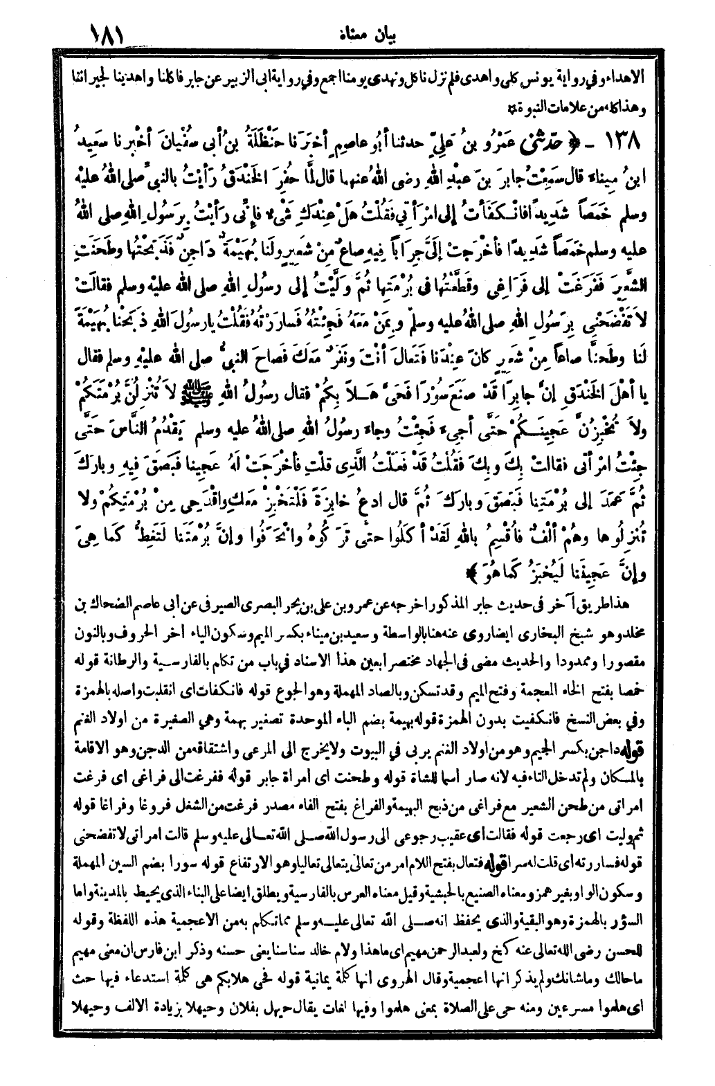 4102 - حدَّثني عَمْرُو بنُ عَلِيٍّ حدَّثنا أبُو عاصِمٍ أخبرَنا حَنْظَلَةُ بنُ أبِي سُفْيَانَ أخْبرَنَا سَعِيدُ ابنُ مِينَاءَ قَالَ سَمِعْتُ جابِرَ بنَ عَبْدِ الله رَضِي الله تَعَالَى عنهُما قَالَ لَمَّا حُفِرَ الخَنْدَقُ رأيْتُ بالنَّبِيِّ صلى الله عَلَيْهِ وَسلم خَمَصَاً شَدِيدَاً افانْكَفَأتُ إِلَى امْرَأتِي فقُلْتُ هَلْ عِنْدَكِ شَيْءٌ فإنِّي رأيْتُ بِرَسُولِ الله صلى الله عَلَيْهِ وَسلم خَمَصَاً شَدِيدَاً فأخْرَجتُ إلَيَّ جِرَابَاً فِيهِ صاعٌ مِنْ شَعِيرٍ ولَنَا بُهَيْمَةٌ دَاجِنٌ فذَبَحْتُهَا وطَحَنَتِ الشَّعِيرَ ففَرَغَتْ إلَى فَرَاغِي وقَطَّعْتُهَا فِي بُرْمَتِهَا ثُمَّ وَلَّيْتُ إلَى رسُولِ الله صلى الله عَلَيْهِ وَسلم فقالَتْ لاَ تَفْضَحْنِي بِرَسُولِ الله صلى الله عَلَيْهِ وَسلم وبِمَنْ معَهُ فَجِئْتُهُ فَسَارَرْتُهُ فَقُلْتُ يَا رسُولَ الله ذَبَحْنَا بُهَيْمَةً لَنَا وطَحنَّا صَاعا مِنْ شَعِيرٍ كانَ عِنْدَنَا فتَعَالَ أنْتَ ونفَرٌ مَعَكَ فَصاحَ النَّبِيُّ صلى الله عَلَيْهِ وَسلم فَقَالَ يَا أهل الخَنْدَق إِن جَابر قد صنع سورا فحيَّ هلا بكم فَقَالَ رَسُول الله صلى الله عَلَيْهِ وَسلم لاَ تُنْزِلُنَّ بِرُمَتَكُمْ ولاَ تُخْبِزُنَّ عَجِينَكُمْ حَتَّى أجِىءَ فَجِئْتُ وجَاءَ رسُولُ الله صلى الله عَلَيْهِ وَسلم يَقْدُمُ النَّاسَ حَتَّى جِئْتُ امْرَأتِي فقالَتْ بِكَ وبِكَ فقُلْتُ قَدْ فَعَلْتُ الَّذِي قلْتِ فأخْرَجَتْ لَهُ عَجِينَاً فبَصَقَ فِيهِ وبارَكَ ثُمَّ عَمَدَ إلَى بُرْمَتَيْنَا فبَصَقَ وبارَكَ ثُمَّ قَالَ ادْعُ خَابِزَةً فَلْتَخْبِزْ مَعَكِ واقْدَحِي مِنْ بُرْمَتِكُمْ وَلاَ تُنْزِلُوهَا وهُمْ ألْفٌ فأُقُسِمُ بِاللَّه لَقَدْ أكَلُوا حَتَّى تَرَكُوهُ وانْحَرَفُوا وإنَّ بُرْمَتَنَا لَتَغِطُّ كمَا هِيَ وإنَّ عَجِينَنَا لَيُخبَزُ كَما هُوَ. .