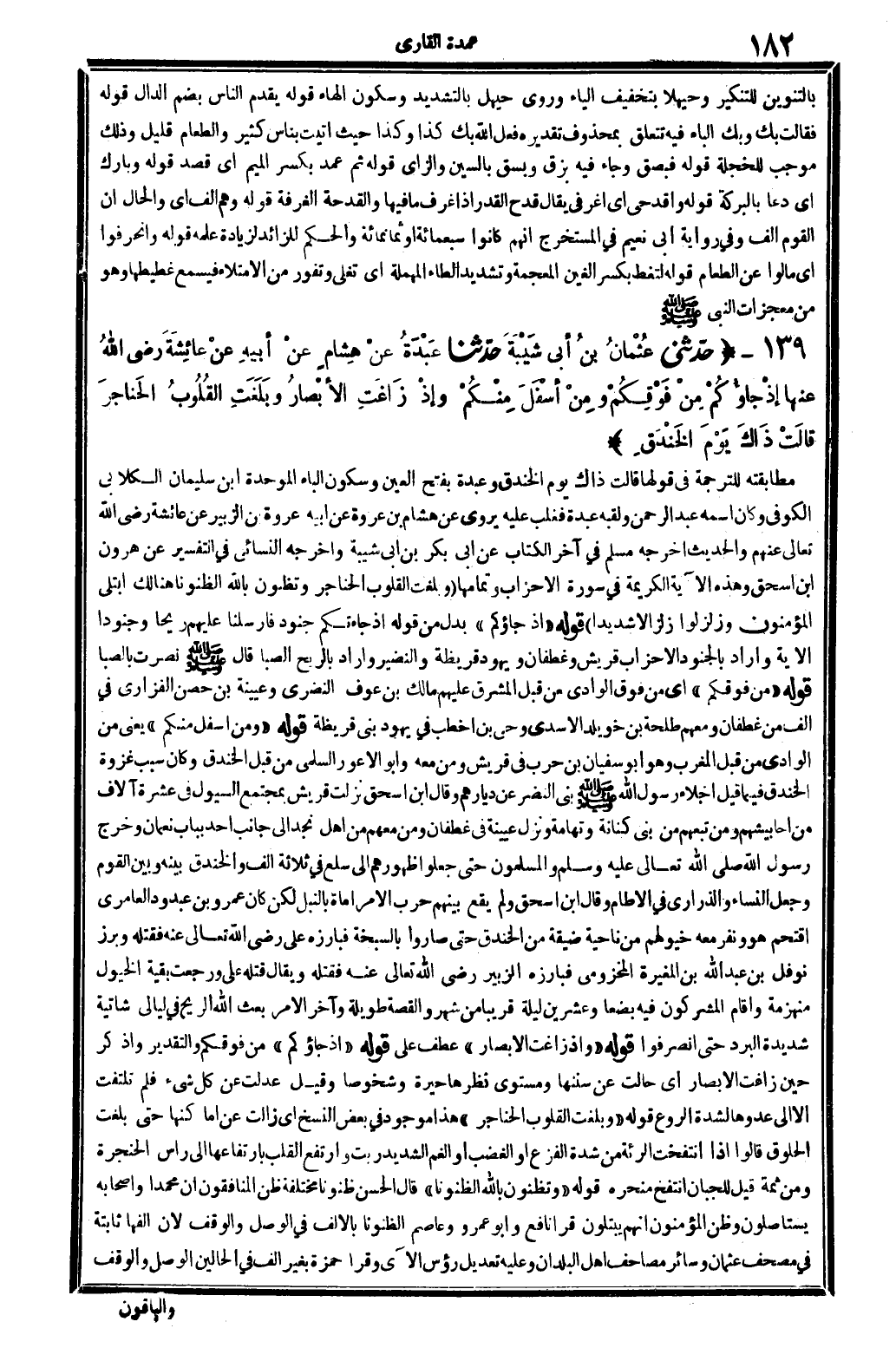 139 - (حَدثنِي عُثْمَان بن أبي شيبَة حَدثنَا عَبدة عَن هِشَام عَن أَبِيه عَن عَائِشَة رَضِي الله عَنْهَا {إِذْ جاؤكم من فَوْقكُم وَمن أَسْفَل مِنْكُم وَإِذ زاغت الْأَبْصَار وَبَلغت الْقُلُوب الْحَنَاجِر} قَالَت ذَاك يَوْم الخَنْدَق) مطابقته للتَّرْجَمَة فِي قَوْلهَا قَالَت ذَاك يَوْم الخَنْدَق وَعَبدَة بِفَتْح الْعين وَسُكُون الْبَاء الْمُوَحدَة ابْن سُلَيْمَان الْكلابِي الْكُوفِي وَكَانَ اسْمه عبد الرَّحْمَن ولقبه عَبدة فغلب عَلَيْهِ يروي عَن هِشَام بن عُرْوَة عَن أَبِيه عُرْوَة بن الزبير عَن عَائِشَة رَضِي الله تَعَالَى عَنْهُم والْحَدِيث أخرجه مُسلم فِي آخر الْكتاب عَن أبي بكر بن أبي شيبَة وَأخرجه النَّسَائِيّ فِي التَّفْسِير عَن هرون بن إِسْحَق وَهَذِه الْآيَة الْكَرِيمَة فِي سُورَة الْأَحْزَاب وَتَمَامه {وَبَلغت الْقُلُوب الْحَنَاجِر وتظنون بِاللَّه الظنونا هُنَالك ابْتُلِيَ الْمُؤْمِنُونَ وزلزلوا زلزالا شَدِيدا} قَوْله {إِذْ جاؤكم} بدل من قَوْله إِذْ جاءتكم جنود فَأَرْسَلنَا عَلَيْهِم ريحًا وجنودا الْآيَة وَأَرَادَ بالجنود الْأَحْزَاب قُرَيْش وغَطَفَان ويهود قُرَيْظَة وَالنضير وَأَرَادَ بِالرِّيحِ الصِّبَا قَالَ - صَلَّى اللَّهُ عَلَيْهِ وَسَلَّم َ - نصرت بالصبا قَوْله {من فَوْقكُم} أَي من فَوق الْوَادي من قبل الْمشرق عَلَيْهِم مَالك بن عَوْف النضري وعيينة بن حصن الْفَزارِيّ فِي ألف من غطفان وَمَعَهُمْ طَلْحَة بن خويلد الْأَسدي وحيي بن أَخطب فِي يهود بني قُرَيْظَة قَوْله {وَمن أَسْفَل مِنْكُم} يَعْنِي من الْوَادي من قبل الْمغرب وَهُوَ أَبُو سُفْيَان بن حَرْب فِي قُرَيْش وَمن مَعَه وَأَبُو الْأَعْوَر السّلمِيّ من قبل الخَنْدَق وَكَانَ سَبَب غَزْوَة الخَنْدَق فِيمَا قيل إجلاء رَسُول الله - صَلَّى اللَّهُ عَلَيْهِ وَسَلَّم َ - بني النَّضر عَن دِيَارهمْ وَقَالَ ابْن إِسْحَق نزلت قُرَيْش بمجتمع السُّيُول فِي عشرَة آلَاف من أحابيشهم وَمن تَبِعَهُمْ من بني كنَانَة وتهامة وَنزل عُيَيْنَة فِي غطفان وَمن مَعَهم من أهل نجد إِلَى جَانب أحد بِبَاب نعْمَان وَخرج رَسُول الله - صَلَّى اللَّهُ عَلَيْهِ وَسَلَّم َ - والمسلمون حَتَّى جعلُوا ظُهُورهمْ إِلَى سلع فِي ثَلَاثَة ألف وَالْخَنْدَق بَينه وَبَين الْقَوْم وَجعل النِّسَاء والذراري فِي الأطام وَقَالَ ابْن إِسْحَق وَلم يَقع بَينهم حَرْب إِلَّا مرماة بِالنَّبلِ لَكِن كَانَ عَمْرو بن عبدود العامري اقتحم هُوَ وَنَفر مَعَه خيولهم من نَاحيَة ضيقَة من الخَنْدَق حَتَّى صَارُوا بالسبخة فبارزه عَليّ رَضِي الله تَعَالَى عَنهُ فَقتله وبرز نَوْفَل بن عبد الله بن الْمُغيرَة المَخْزُومِي فبارزه الزبير رَضِي الله تَعَالَى عَنهُ فَقتله وَيُقَال قَتله عَليّ وَرجعت بَقِيَّة الْخُيُول منهزمة وَأقَام الْمُشْركُونَ فِيهِ بضعا وَعشْرين لَيْلَة قَرِيبا من شهر والقصة طَوِيلَة وَآخر الْأَمر بعث الله الرّيح فِي ليَالِي شَاتِيَة شَدِيدَة الْبرد حَتَّى انصرفوا قَوْله {وَإِذ زاغت الْأَبْصَار} عطف على قَوْله {إِذْ جاؤكم} من فَوْقكُم وَالتَّقْدِير وَاذْكُر حِين زاغت الْأَبْصَار أَي حَالَتْ عَن سننها ومستوى نظرها حيرة وشخوصا وَقيل عدلت عَن كل شَيْء فَلم تلْتَفت إِلَّا إِلَى عدوها لشدَّة الروع قَوْله {وَبَلغت الْقُلُوب الْحَنَاجِر} هَذَا مَوْجُود فِي بعض النّسخ أَي زَالَت عَن أماكنها حَتَّى بلغت الحلوق قَالُوا إِذا انتفخت الرئة من شدَّة الْفَزع أَو الْغَضَب أَو الْغم الشَّديد ربت وارتفع الْقلب بارتفاعها إِلَى رَأس الحنجرة وَمن ثمَّة قيل للجبان انتفخ منحره قَوْله {وتظنون بِاللَّه الظنونا} قَالَ الْحسن ظنونا مُخْتَلفَة ظن المُنَافِقُونَ أَن مُحَمَّدًا وَأَصْحَابه يستأصلون وَظن الْمُؤْمِنُونَ أَنهم يبتلون قَرَأَ نَافِع وَأَبُو عَمْرو وَعَاصِم الظنونا بِالْألف فِي الْوَصْل وَالْوَقْف لِأَن أ