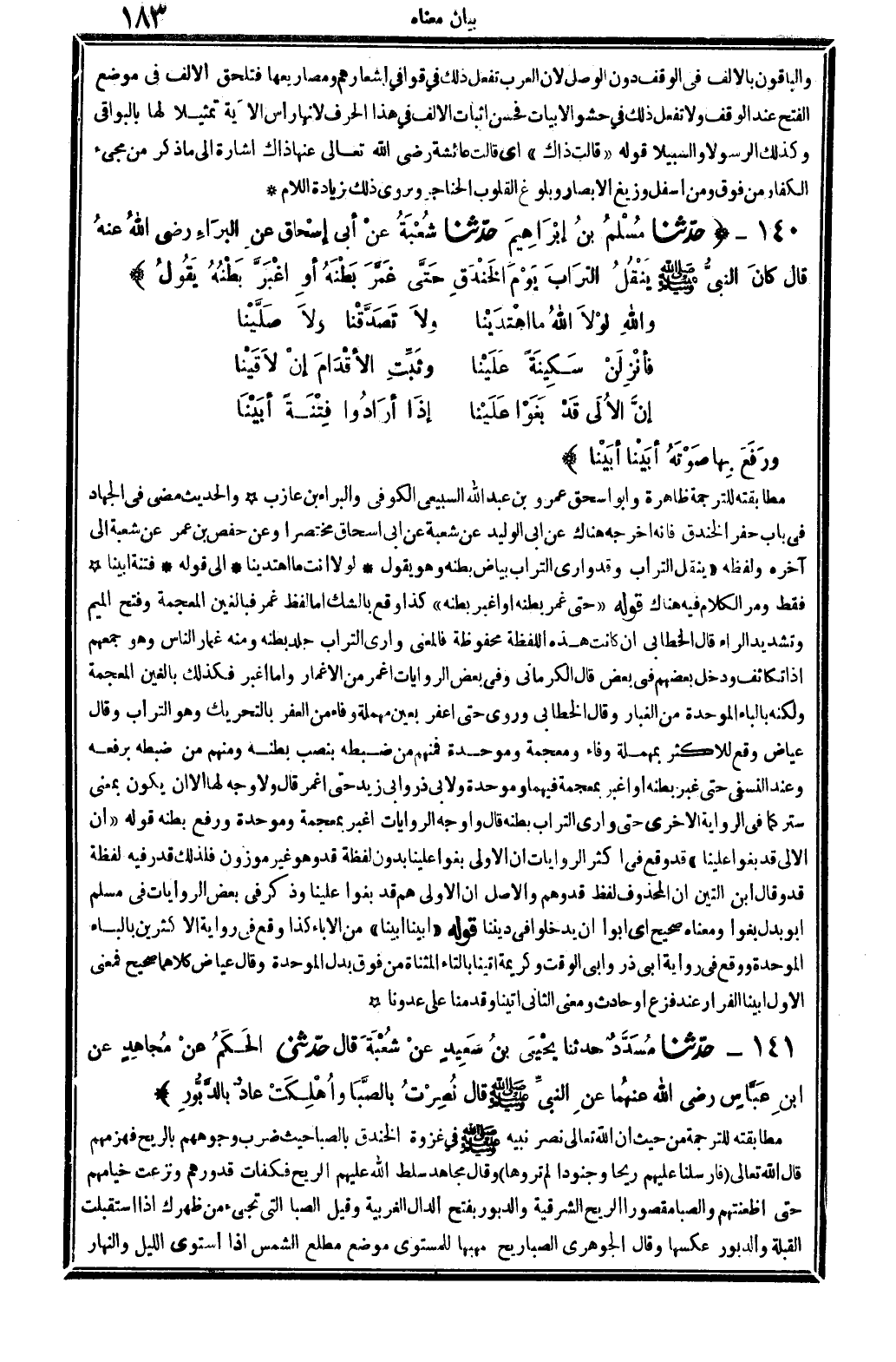 4104 - حدَّثنا مُسْلمُ بنُ إبْرَاهِيمَ حدَّثنا شُعْبَةُ عَنْ أبِي إسْحَاقَ عنِ البَرَاءِ رَضِي الله تَعَالَى عنهُ قَالَ كانَ النَّبِيُّ صلى الله عَلَيْهِ وَسلم يَنْقُلُ التُّرَابَ يَوْمَ الخَنْدَقِ حَتَّى غَمَّرَ بَطْنَهُ أوِ اغْبَرَّ بَطْنُهُ يَقُولُ: