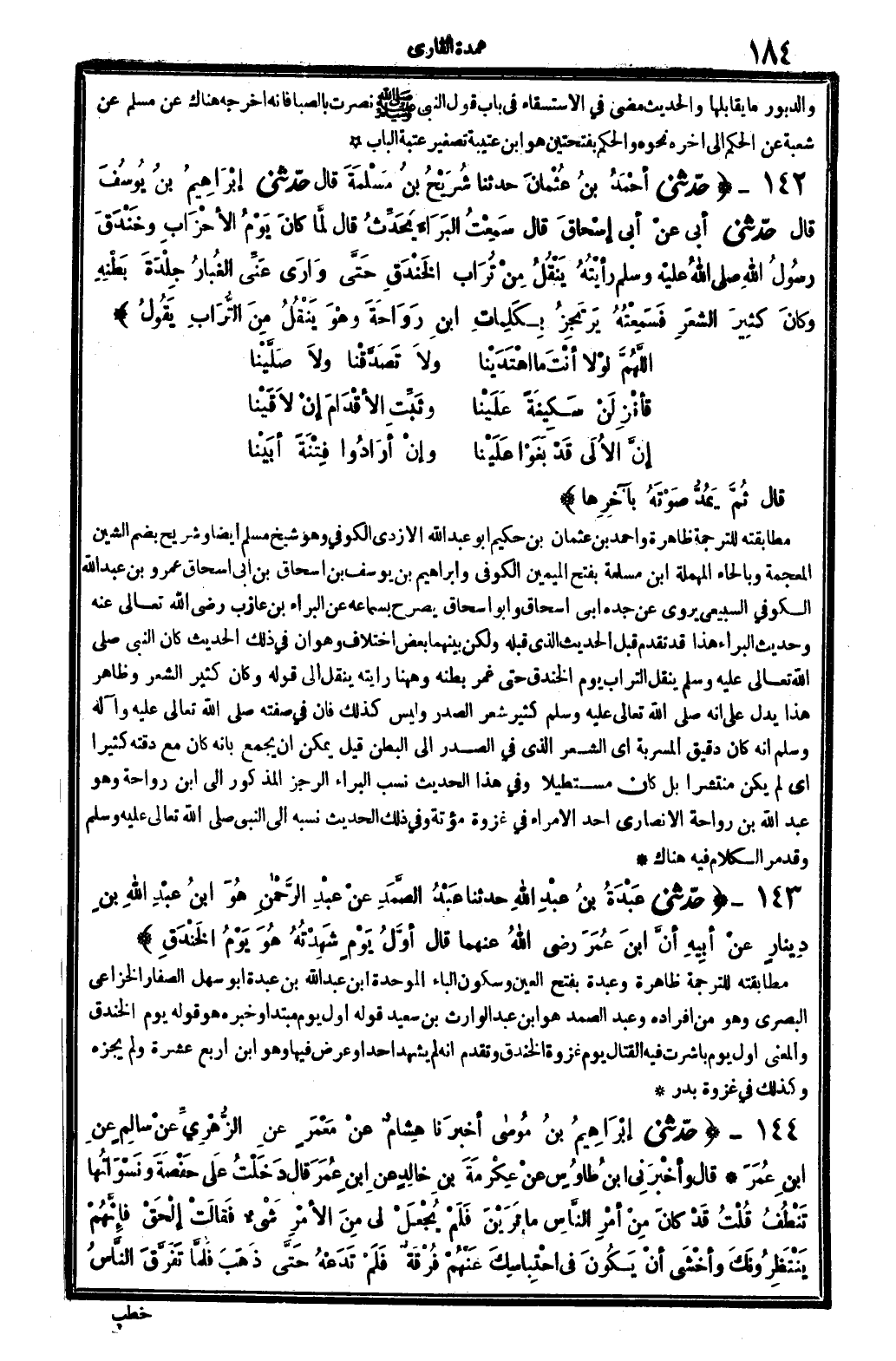 وَحَدِيث الْبَراء هَذَا قد تقدم قبل الحَدِيث الَّذِي قبله، وَلَكِن بَينهمَا بعض اخْتِلَاف، وَهُوَ أَن فِي ذَلِك الحَدِيث: كَانَ النَّبِي صلى الله عَلَيْهِ وَسلم، ينْقل التُّرَاب يَوْم الخَنْدَق حَتَّى غمر بَطْنه، وَهَهُنَا (رَأَيْته ينْقل. .) إِلَى قَوْله: (وَكَانَ كثير الشّعْر) وَظَاهر هَذَا يدل على أَنه صلى الله عَلَيْهِ وَسلم كثير شعر الصَّدْر، وَلَيْسَ كَذَلِك، فَإِن فِي صفته صلى الله عَلَيْهِ وَسلم أَنه كَانَ دَقِيق المسربة، أَي: الشّعْر الَّذِي فِي الصَّدْر إِلَى الْبَطن، قيل: يُمكن أَن يجمع بِأَنَّهُ كَانَ مَعَ دقته كثيرا أَي: لم يكن منتشراً بل كَانَ مستطيلاً. وَفِي هَذَا الحَدِيث نسب الْبَراء الرجز الْمَذْكُور إِلَى ابْن رَوَاحَة، وَهُوَ عبد الله بن رَوَاحَة الْأنْصَارِيّ أحد الْأُمَرَاء فِي غَزْوَة مُؤْتَة، وَفِي ذَلِك الحَدِيث نسبه إِلَى النَّبِي صلى الله عَلَيْهِ وَسلم، وَقد مر الْكَلَام فِيهِ هُنَاكَ.