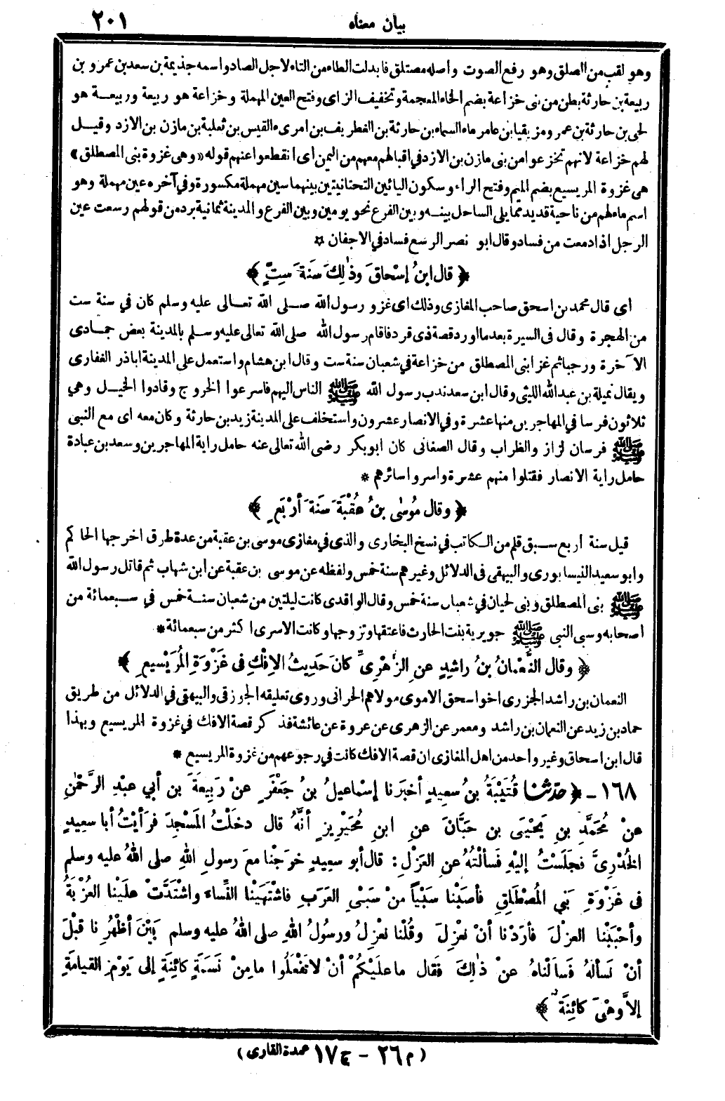 قيل: سنة أَربع، سبق قلم من الْكَاتِب فِي نسخ البُخَارِيّ، وَالَّذِي فِي (مغازي مُوسَى بن عقبَة) من عدَّة طرق أخرجهَا الْحَاكِم وَأَبُو سعيد النَّيْسَابُورِي وَالْبَيْهَقِيّ فِي (الدَّلَائِل) وَغَيرهم: سنة خمس، وَلَفظه عَن مُوسَى بن عقبَة عَن ابْن شهَاب، ثمَّ قَاتل رَسُول الله، صلى الله عَلَيْهِ وَسلم بني المصطلق وَبني لحيان فِي شعْبَان سنة خمس، وَقَالَ الْوَاقِدِيّ، كَانَت لَيْلَتَيْنِ من شعْبَان سنة خمس فِي سَبْعمِائة من أَصْحَابه وَسبي النَّبِي صلى الله عَلَيْهِ وَسلم جوَيْرِية بنت الْحَارِث فَأعْتقهَا وَتَزَوجهَا، وَكَانَت الأسرى أَكثر من سَبْعمِائة.