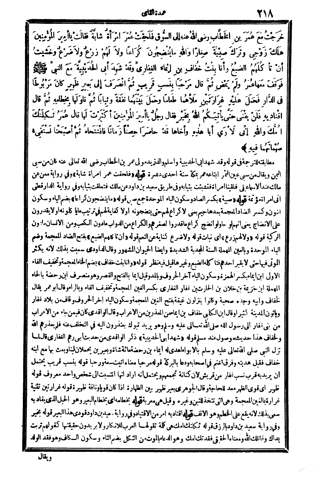 خرجت مَعَ عمر بن الْخطاب رَضِي الله عَنهُ إِلَى السُّوق فلحقت عمر امْرَأَة شَابة فَقَالَت يَا أَمِير الْمُؤمنِينَ هلك زَوجي وَترك صبية صغَارًا وَالله مَا ينضجون كُرَاعًا وَلَا لَهُم زرع وَلَا ضرع وخشيت أَن تأكلهم الضبع وَأَنا بنت خفاف بن إِيمَاء الْغِفَارِيّ وَقد شهد أبي الْحُدَيْبِيَة مَعَ النَّبِي - صَلَّى اللَّهُ عَلَيْهِ وَسَلَّم َ - فَوقف مَعهَا عمر وَلم يمض ثمَّ قَالَ مرْحَبًا بِنسَب قريب ثمَّ انْصَرف إِلَى بعير ظهير كَانَ مربوطا فِي الدَّار فَحمل عَلَيْهِ غرارتين ملأهما طَعَاما وَحمل بَينهمَا نَفَقَة وثيابا ثمَّ ناولها بخطامه ثمَّ قَالَ اقتاديه فَلَنْ يفنى حَتَّى يأتيكم الله بِخَير فَقَالَ رجل يَا أَمِير الْمُؤمنِينَ أكثرت لَهَا قَالَ عمر ثكلتك أمك وَالله إِنِّي لأرى أَبَا هَذِه وأخاها قد حاصرا حصنا زَمَانا فافتتحاه ثمَّ أَصْبَحْنَا نستفيء سهمانهما فِيهِ) مطابقته للتَّرْجَمَة فِي قَوْله وَقد شهد أبي الْحُدَيْبِيَة وَأسلم وَالِد زيد مولى عمر بن الْخطاب رَضِي الله تَعَالَى عَنهُ كَانَ من سبي الْيمن وَيُقَال من سبي عين التَّمْر ابتاعه عمر بِمَكَّة سنة إِحْدَى عشرَة قَوْله " فلحقت عمر امْرَأَة شَابة " وَفِي رِوَايَة معن عَن مَالك عِنْد الْإِسْمَاعِيلِيّ فلقينا امْرَأَة فتشبثت بثيابه وَفِي طَرِيق سعيد بن دَاوُد عَن مَالك فتعلقت بثيابه وَفِي رِوَايَة الدَّارَقُطْنِيّ إِنِّي امْرَأَة مؤتمة قَوْله " صبية " بِكَسْر الصَّاد وَسُكُون الْبَاء الْمُوَحدَة جمع صبي قَوْله " مَا ينضجون كُرَاعًا " بِضَم الْيَاء وَسُكُون النُّون وَكسر الصَّاد الْمُعْجَمَة بعْدهَا جِيم يَعْنِي لَا كرَاع لَهُم حَتَّى ينضجونه أَو لَا كِفَايَة لَهُم فِي تَرْتِيب مَا يَأْكُلُونَهُ أَو لَا يقدرُونَ على الإنضاج يَعْنِي أَنهم لَو حاولوا نضج كرَاع مَا قدرُوا لصغرهم والكراع من الدَّوَابّ مَا دون الكعب وَمن الْإِنْسَان مَا دون الرّكْبَة قَوْله " وَلَا لَهُم زرع " أَي نَبَات قَوْله وَلَا ضرع كِنَايَة عَن النعم قَوْله " أَن تأكلهم الضبع " بِفَتْح الضَّاد الْمُعْجَمَة وَضم الْبَاء الْمُوَحدَة وبالعين الْمُهْملَة السّنة المجدبة الشَّدِيدَة وَأَيْضًا الْحَيَوَان الْمَشْهُور وَقَالَ الدَّاودِيّ سميت بذلك لِأَنَّهُ يكثر الْمَوْتَى فِيهَا حَتَّى لَا يقبر أحدهم فتأكله الضبع وَغَيرهَا قيل فِيهِ نظر قَوْله " وَأَنا بنت خفاف " بِضَم الْخَاء الْمُعْجَمَة وَتَخْفِيف الْفَاء الأولى ابْن إِيمَاء بِكَسْر الْهمزَة وَسُكُون الْيَاء آخر الْحُرُوف وبالمد وَقيل أَيّمَا بِالْفَتْح وَالْقصر وَهُوَ منصرف ابْن رحضة بِالْحَاء الْمُهْملَة ابْن خُزَيْمَة بن خلان بن الْحَارِث بن غفار الْغِفَارِيّ بِكَسْر الْغَيْن الْمُعْجَمَة وَتَخْفِيف الْفَاء وبالراء وَقَالَ أَبُو عمر يُقَال لخفاف وَأَبِيهِ وجده صُحْبَة وَكَانُوا ينزلون غيقة بِفَتْح الْغَيْن الْمُعْجَمَة وَسُكُون الْيَاء آخر الْحُرُوف وقاف من بِلَاد غفار ويأتون الْمَدِينَة كثيرا وَقَالَ ابْن الْكَلْبِيّ خفاف بن إِيمَاء من المعذرين من الْأَعْرَاب وَقَالَ الْوَاقِدِيّ كَانَ فِيمَن جَاءَ من الْأَعْرَاب من بني غفار إِلَى رَسُول الله - صَلَّى اللَّهُ عَلَيْهِ وَسَلَّم َ - وَهُوَ يُرِيد تَبُوك يَعْتَذِرُونَ إِلَيْهِ فِي التَّخَلُّف عَنهُ فَلم يعذرهم الله ولخفاف هَذَا حَدِيث مَوْصُول عِنْد مُسلم قَوْله " شهد أبي الْحُدَيْبِيَة " ذكر الْوَاقِدِيّ من حَدِيث أبي رهم الْغِفَارِيّ قَالَ لما نزل النَّبِي - صَلَّى اللَّهُ عَلَيْهِ وَسَلَّم َ - بالأبواء أهْدى لَهُ إِيمَاء بن رحضة مائَة شَاة وبعيرين يحْملَانِ لَبَنًا وَبعث بهَا مَعَ ابْنه خفاف فَقبل هديته وَفرق الْغنم فِي أَصْحَابه ودعا بِالْبركَةِ قَوْله مرْحَبًا مَعْنَاهُ أتيت سَعَة ورحبا قَوْله بِنسَب قريب يحْتَمل أَن يُرِيد بِهِ قرب نسب غفار من قُرَيْش لِأَن كنَانَة تجمعهم وَ