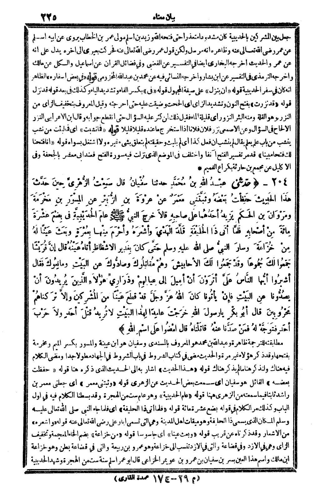 جعل بَين الْمُشْركين بِالْحُدَيْبِية كَانَ مشدودا متعذرا حَتَّى فَتحه الله وَزيد بن أسلم مولى عمر بن الْخطاب يروي عَن أَبِيه أسلم عَن عمر رَضِي الله تَعَالَى عَنهُ وَظَاهره أَنه مُرْسل وَلَكِن قَول عمر رَضِي الله تَعَالَى عَنهُ فحركت بَعِيري إِلَى آخِره يدل على أَنه عَن عمر والْحَدِيث أخرجه البُخَارِيّ أَيْضا فِي التَّفْسِير عَن القعْنبِي وَفِي فَضَائِل الْقُرْآن عَن إِسْمَاعِيل وَالْكل عَن مَالك وَأخرجه التِّرْمِذِيّ فِي التَّفْسِير عَن ابْن بشار وَأخرجه النَّسَائِيّ فِيهِ عَن مُحَمَّد بن عبد الله المَخْزُومِي قَوْله " فِي بعض أَسْفَاره " الظَّاهِر أَنه كَانَ فِي سفر الْحُدَيْبِيَة قَوْله " أَن ينزل " على صِيغَة الْمَجْهُول قَوْله " فِي " بِكَسْر الْفَاء وَتَشْديد الْيَاء وَكَذَلِكَ فِي بعد قَوْله قد نزل قَوْله " قد نزرت " بِفَتْح النُّون وَتَشْديد الزَّاي أَي ألححت وضيقت عَلَيْهِ حَتَّى أحرجته وَقيل الْمَعْرُوف بتَخْفِيف الزَّاي من النزر وَهُوَ الْقلَّة وَمِنْه الْبِئْر النزور أَي قَليلَة المَاء فَقيل ذَلِك لمن كثر عَلَيْهِ السُّؤَال حَتَّى انْقَطع جَوَابه وَقَالَ ابْن الْأَعرَابِي النزر الإلحاح فِي السُّؤَال وَعَن الْأَصْمَعِي نزر فلَان فلَانا إِذا استخرج مَا عِنْده قَلِيلا قَلِيلا قَوْله " فَمَا نشبت " أَي فَمَا لَبِثت من نشب ينشب من بَاب علم يعلم يُقَال لم ينشب أَن فعل كَذَا أَي لم يلبث وَحَقِيقَته لم يتَعَلَّق بِشَيْء غَيره وَلَا اشْتغل بسواه قَوْله " إِنَّا فتحنا لَك فتحا مُبينًا " قد مر تَفْسِير الْفَتْح آنِفا وَاخْتلف فِي الْموضع الَّذِي نزلت فِيهِ سُورَة الْفَتْح فَعِنْدَ أبي معشر بِالْجُحْفَةِ وَفِي الإكليل عَن مجمع بن حَارِثَة بكراع الغميم -