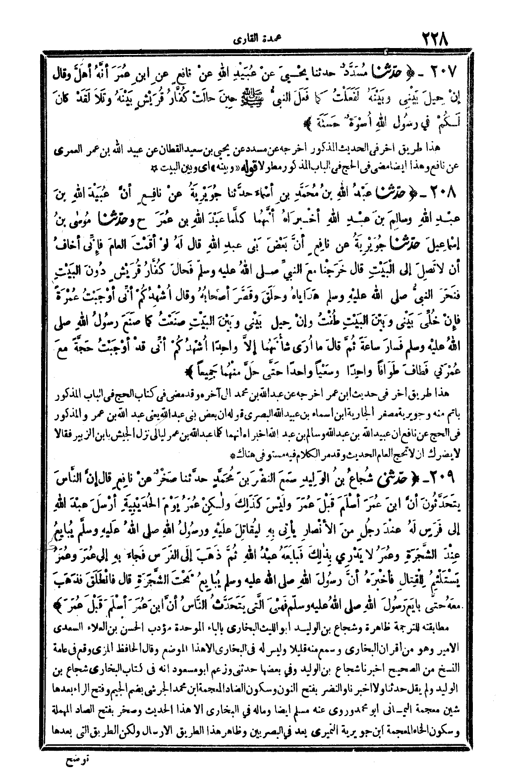 207 - حَدثنَا مُسَدّد حَدثنَا يحيى عَن عبيد الله عَن نَافِع عَن ابْن عمر أَنه أهل وَقَالَ إِن حيل بيني وَبَينه لفَعَلت كَمَا فعل رَسُول الله صلى الله عَلَيْهِ وَسلم حِين حَالَتْ كفار قُرَيْش بَينه وتلا {لقد كَانَ لكم فِي رَسُول الله أُسْوَة حَسَنَة} .