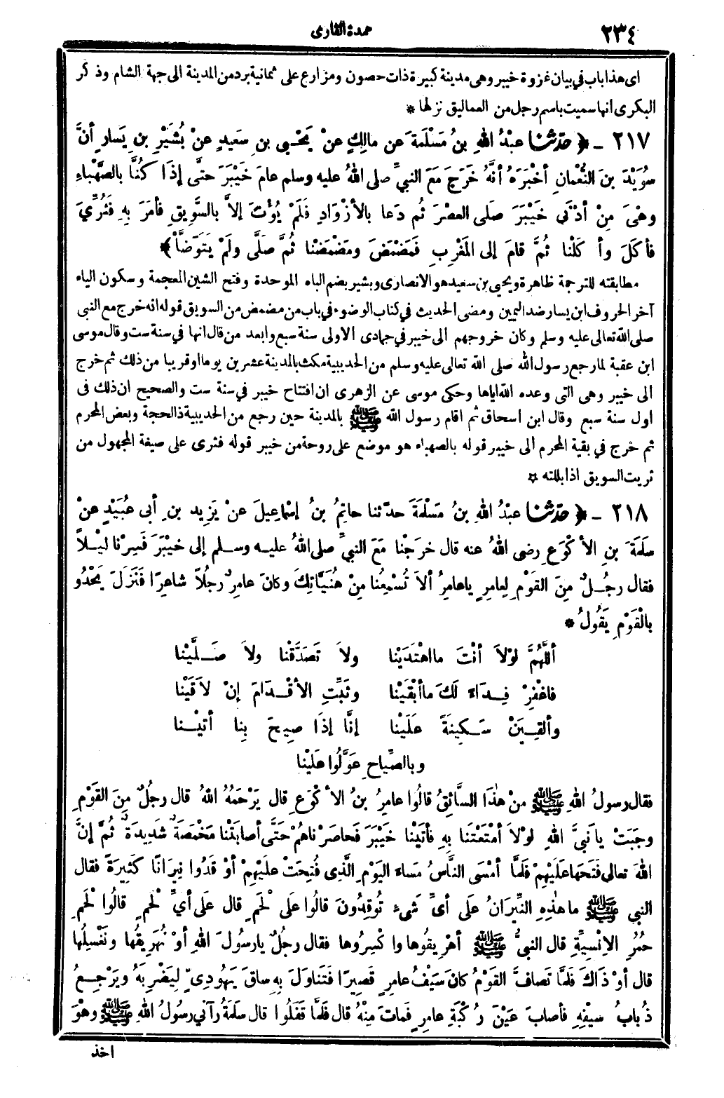 218 - (حَدثنَا عبد الله بن مسلمة حَدثنَا حَاتِم بن إِسْمَاعِيل عَن يزِيد بن أبي عبيد عَن سَلمَة بن الْأَكْوَع رَضِي الله عَنهُ قَالَ خرجنَا مَعَ النَّبِي - صَلَّى اللَّهُ عَلَيْهِ وَسَلَّم َ - إِلَى خَيْبَر فسرنا لَيْلًا فَقَالَ رجل من الْقَوْم لعامر يَا عَامر أَلا تسمعنا من هنياتك وَكَانَ عَامر رجلا شَاعِرًا فَنزل يَحْدُو بالقوم يَقُول