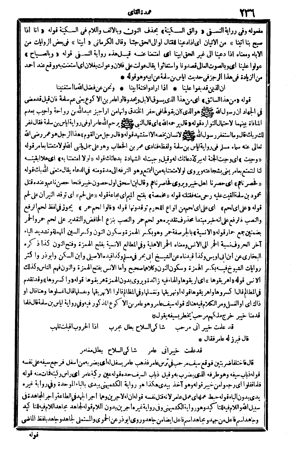 قَوْله " من هَذَا السَّائِق " أَي من هَذَا الَّذِي يَسُوق الْإِبِل ويحدو قَالُوا عَامر بن الْأَكْوَع يَعْنِي عَم سَلمَة فَإِن قيل قد مضى فِي الْجِهَاد أَن رَسُول الله - صَلَّى اللَّهُ عَلَيْهِ وَسَلَّم َ - هُوَ الَّذِي كَانَ يَقُولهَا فِي حفر الخَنْدَق وَأَنَّهَا من أراجيز عبد الله بن رَوَاحَة وَأجِيب بِعَدَمِ الْمُنَافَاة بَينهمَا لاحْتِمَال التوارد قَوْله " قَالَ يرحمه الله " أَي قَالَ النَّبِي - صَلَّى اللَّهُ عَلَيْهِ وَسَلَّم َ - يرحم الله عَامِرًا وَفِي رِوَايَة إِيَاس بن سَلمَة فَقَالَ غفر لَك رَبك قَالَ وَمَا اسْتغْفر رَسُول الله - صَلَّى اللَّهُ عَلَيْهِ وَسَلَّم َ - لإِنْسَان يَخُصُّهُ إِلَّا اسْتشْهد قَوْله " قَالَ رجل من الْقَوْم " هَذَا الرجل هُوَ عمر رَضِي الله تَعَالَى عَنهُ سَمَّاهُ مُسلم فِي رِوَايَة إِيَاس بن سَلمَة وَلَفظه فَنَادَى عمر بن الْخطاب وَهُوَ على جمل يَا نَبِي الله لَوْلَا متعتنا بعامر قَوْله " وَجَبت " أَي وَجَبت الْجنَّة لَهُ ببركة دعائك لَهُ وَقيل وَجَبت لَهُ الشَّهَادَة بدعائك قَوْله " لَوْلَا أمتعتنا بِهِ " أَي هلا أبقيته لنا لنتمتع بعامر يَعْنِي بشجاعته ويروى لَوْلَا متعتنا بِهِ من التَّمَتُّع وَهُوَ الترفه إِلَى مُدَّة وَمِنْه فِي الدُّعَاء يُقَال متعني الله بك قَوْله " فحصرناهم " أَي حصرنا أهل خَيْبَر ويروى فحاصرناهم وَقَالَ ابْن إِسْحَق أول حصون خَيْبَر فتحا حصن ناعم وَعِنْده قتل مَحْمُود بن سَلمَة ألقيت عَلَيْهِ رحى مِنْهُ فَقتلته قَوْله " مَخْمَصَة " بِفَتْح الْمِيم أَي مجاعَة قَوْله " على لحم " أَي توقد النيرَان على لحم قَوْله " على أَي لحم " أَي على أَي لحم من أَنْوَاع اللحوم توقدونها قَوْله " قَالُوا لحم حمر " يجوز فِي لفظ لحم الرّفْع وَالنّصب فالرفع على أَنه خبر مُبْتَدأ مَحْذُوف تَقْدِيره هُوَ لحم حمر وَالنّصب بِنَزْع الْخَافِض وَالتَّقْدِير على لحم حمر والحمر بِضَمَّتَيْنِ جمع حمَار قَوْله " الإنسية " بِالْجَرِّ صفة حمر وَهُوَ بِكَسْر الْهمزَة وَسُكُون النُّون وَكسر السِّين الْمُهْملَة وَتَشْديد الْيَاء آخر الْحُرُوف نِسْبَة الْحمر إِلَى الْإِنْس وَمَعْنَاهُ الْحمر الْأَهْلِيَّة وَفِي الْمطَالع الأنسية بِفَتْح الْهمزَة وَفتح النُّون كَذَا ذكره البُخَارِيّ عَن ابْن أبي أويس وَكَذَا قيدناه عَن الشَّيْخ أبي بَحر فِي مُسلم وَكَذَا قَيده الْأصيلِيّ وَابْن السكن وَأَبُو ذَر وَأكْثر رِوَايَات الشُّيُوخ فِيهِ بِكَسْر الْهمزَة وَسُكُون النُّون وَكِلَاهُمَا صَحِيح وَأما الْأنس بِفَتْح الْهمزَة وَالنُّون فهم النَّاس وَكَذَلِكَ الْإِنْس قَوْله " أهريقوها " أَي أريقوها وَالْهَاء فِيهِ زَائِدَة ويروى بِدُونِ الْهمزَة هريقوها قَوْله " واكسروها " وَقد تقدم فِي الْمَظَالِم قَالَ اكسروها واهريقوها قَوْله أَو نهريقها ونغسلها وَفِي الْمَظَالِم قَالُوا أَلا نهريقها ونغسلها قَالَ اغسلوها وَهنا قَالَ أَو ذَاك أَي أَو الْغسْل وَمر الْكَلَام فِيهِ هُنَاكَ قَوْله سيف عَامر وَهُوَ عَامر بن الْأَكْوَع الْمَذْكُور فِيهِ وَفِي رِوَايَة إِيَاس بن سَلمَة قَالَ فَلَمَّا قدمنَا خَيْبَر خرج ملكهم مرْحَبًا يخْطر بِسَيْفِهِ يَقُول