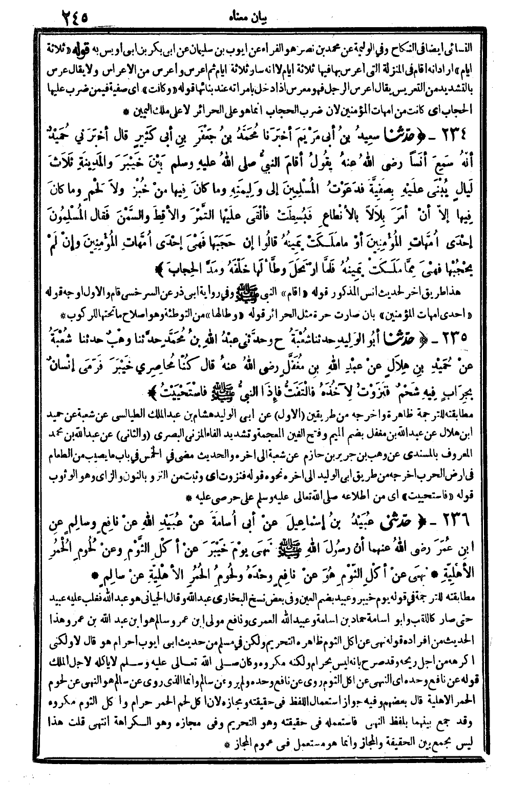 4213 - حدَّثنا سعِيدُ بنُ أبِي مَرْيَمَ أخبرَنَا مُحَمَّدُ بنُ جَعْفَرِ بنِ أبي كَثِيرٍ قَالَ أخْبرَنِي حُمَيْدٌ أنَّهُ سَمِعَ أنَسَاً رَضِي الله تَعَالَى عنهُ يقُولُ أقَامَ النَّبِيُّ صلى الله عَلَيْهِ وَسلم بَيْنَ خَيْبَرَ والمَدِينَةِ ثَلاثَ لَيالٍ يُبْنَى عَلَيْهِ بِصَفِيَّةَ فدَعَوْتُ المُسْلِمِينَ إلَى ولِيمَتِهِ وَمَا كانَ فِيهَا منْ خُبْز ولاَ لَحْمٍ وَمَا كانَ فِيهَا إلاَّ أنْ أمَرَ بِلالاً بالأنْطَاعِ فبُسِطَتْ فألْقَى علَيْهَا التَّمْرَ والأقِطَ والسَّمْنَ فَقالَ المُسْلِمُونَ إحْدَى أُمَّهَاتِ المُؤْمِنِينَ أوْ مَا مَلَكَتْ يَمِينُهِ قالُوا إنْ حَجَبَهَا فَهْيَ إحْدَى أُمَّهَاتِ المُؤْمِنِينَ وإنْ لَمْ يَحْجُبْهَا فَهْيَ مِمَّا مَلَكَتْ يَمِينُهُ فلَمَّا ارْتَحَلَ وطَّألَهَا خَلْفَهُ ومَدَّ الحِجَابَ. .
