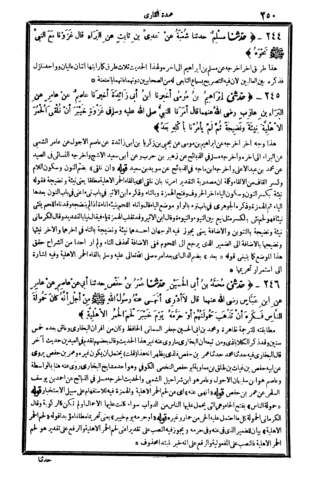 244 - (حَدثنَا مُسلم حَدثنَا شُعْبَة عَن عدي بن ثَابت عَن الْبَراء قَالَ غزونا مَعَ النَّبِي - صَلَّى اللَّهُ عَلَيْهِ وَسَلَّم َ - نَحوه) هَذَا طَرِيق آخر أخرجه عَن مُسلم بن إِبْرَاهِيم إِلَى آخِره وَلِهَذَا الحَدِيث ثَلَاث طرق كَمَا رَأَيْتهَا اثْنَان عاليان وَوَاحِد نَازل فَذكره بَين العاليين لِأَن فِيهِ التَّصْرِيح بِسَمَاع التَّابِعِيّ لَهُ من الصحابيين دوهما فَإِنَّهُمَا بالعنعنة -