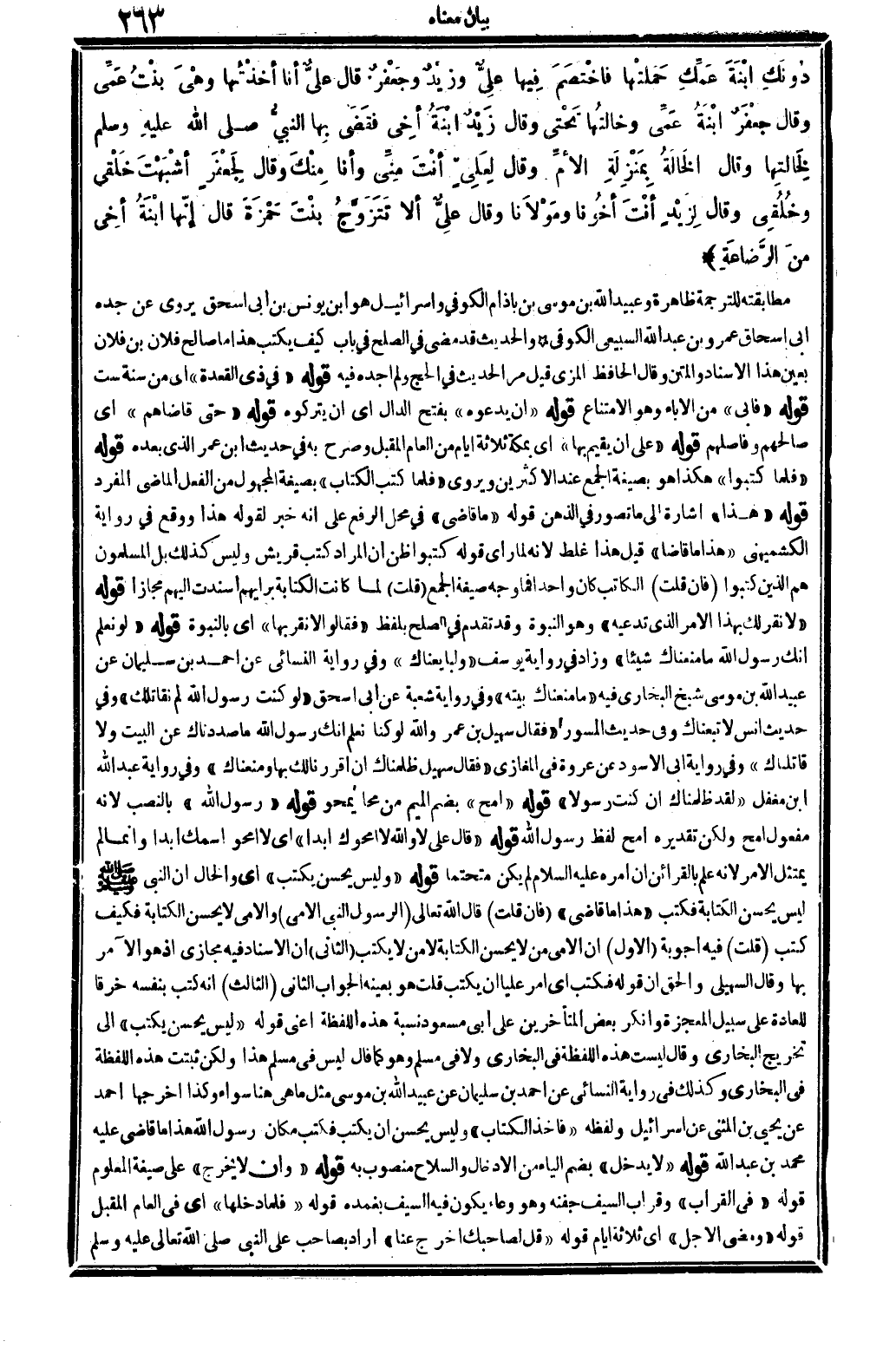 دُونَك ابْنَةَ عَمِّكِ حَمَلتْها فاخْتَصَمَ فِيها علِيٌّ وزَيْدٌ وجَعْفَرٌ. قَالَ عليٌّ أَنا أخذْتُها وهْيَ بنْتُ عَمِّي وَقَالَ جعْفَرٌ ابْنَةُ عَمِّي وخالتُها تَحْتى وَقَالَ زَيْدٌ ابْنَةُ أخِي فقَضَى بِها النبيُّ صلى الله عَلَيْهِ وَسلم لِخَالتِها وَقَالَ الخَالَةُ بِمَنْزِلَةِ الأمِّ. وَقَالَ لِعَلِيّ أنْتَ مِنِّي وَأَنا مِنْكَ وَقَالَ لِجَعْفَرٍ أشْبَهْتَ خَلْقي وخُلُقِي وَقَالَ لِزَيْد أنْتَ أخُونا ومَوْلاَنا وَقَالَ عليٌّ أَلا تَتَزَوَّجُ بنْتَ حَمْزَةَ قَالَ إنّها ابْنَةُ أخِي منَ الرَّضاعَةِ. .