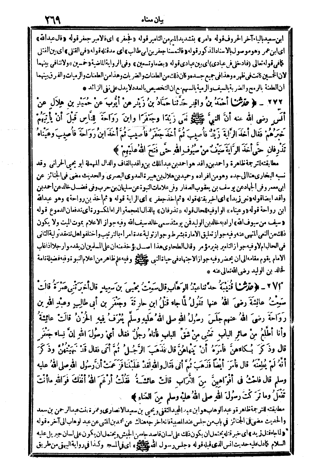 4262 - حدَّثنا أحْمَدُ بنُ واقِدٍ حَدَّثَنا حَمَّادُ بنُ زَيْدٍ عنْ أيُّوبَ عنْ حُمَيْدِ بنِ هِلاَلٍ عنْ أنَسٍ رض الله عَنهُ أنَّ النبيَّ صلى الله عَلَيْهِ وَسلم نَعَى زَيْداً وجَعْفَراً وابنَ رَوَاحَةَ لِلنَّاسِ قَبْلَ أنْ يأتِيهُمْ خَبَرُهُمْ فَقال أخَذَ الرَّايَة زَيْدٌ فأصِيبَ ثُمَّ أخَذَ جَعْفَرٌ فأصيبَ ثُمَّ أخَذَ ابنُ رَوَاحَةَ فأُصِيبَ وَعَيْناهُ تَذْرِفانِ حتَّى أخَذَ الرَّايَةَ سَيْفٌ منْ سُيُوفِ الله حتَّى فَتَحَ الله عَلَيْهِمْ. .