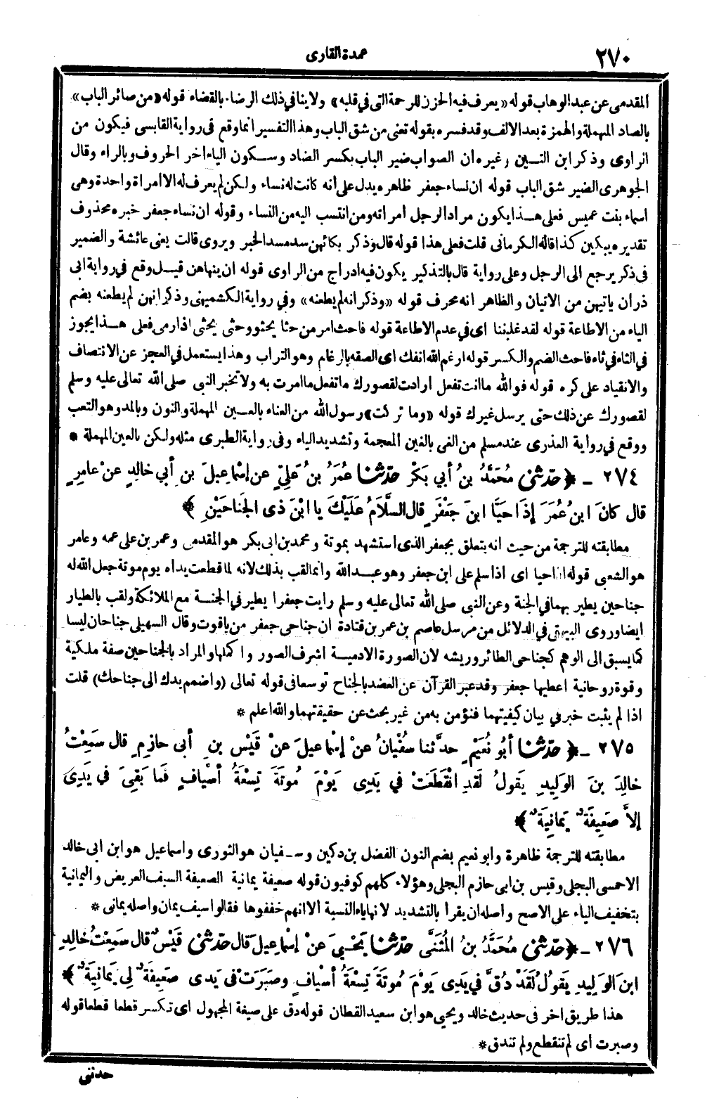 274 - (حَدثنِي مُحَمَّد بن أبي بكر حَدثنَا عمر بن عَليّ عَن إِسْمَاعِيل بن أبي خَالِد عَن عَامر قَالَ كَانَ ابْن عمر إِذا حَيا ابْن جَعْفَر قَالَ السَّلَام عَلَيْك يَا ابْن ذِي الجناحين) مطابقته للتَّرْجَمَة من حَيْثُ أَنه يتَعَلَّق بِجَعْفَر الَّذِي اسْتشْهد بمؤتة وَمُحَمّد بن أبي بكر هُوَ الْمقدمِي وَعمر بن عَليّ عَمه وعامر هُوَ الشّعبِيّ قَوْله إِذا حَيا أَي إِذا سلم على ابْن جَعْفَر وَهُوَ عبد الله وَإِنَّمَا لقب بذلك لِأَنَّهُ لما قطعت يَدَاهُ يَوْم مُؤْتَة جعل الله لَهُ جناحين يطير بهما فِي الْجنَّة وَعَن النَّبِي - صَلَّى اللَّهُ عَلَيْهِ وَسَلَّم َ - رَأَيْت جعفرا يطير فِي الْجنَّة مَعَ الْمَلَائِكَة ولقب بالطيار أَيْضا وروى الْبَيْهَقِيّ فِي الدَّلَائِل من مُرْسل عَاصِم بن عمر بن قَتَادَة أَن جناحي جَعْفَر من ياقوت وَقَالَ السُّهيْلي جَنَاحَانِ ليسَا كَمَا يسْبق إِلَى الْوَهم كجناحي الطَّائِر وريشه لِأَن الصُّورَة الْآدَمِيَّة أشرف الصُّور وأكملها وَالْمرَاد بالجناحين صفة ملكية وَقُوَّة روحانية أعطيها جَعْفَر وَقد عبر الْقُرْآن عَن الْعَضُد بالجناح توسعا فِي قَوْله تَعَالَى {واضمم يدك إِلَى جناحك} قلت إِذا لم يثبت خبر فِي بَيَان كيفيتهما فنؤمن بِهِ من غير بحث عَن حقيقتهما وَالله أعلم -