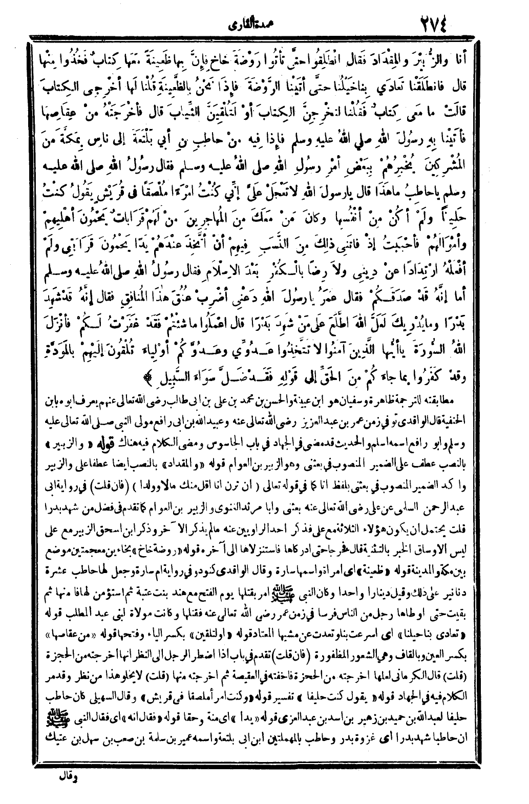 أَنا والزُّبَيْرَ والمِقْدَادَ فَقال انْطلِقُوا حتَّى تأتُوا رَوْضَةَ خاخِ فإنَّ بِها ظَعِنَةً مَعَها كِتابٌ فَخُذُوا مِنْها قَالَ فانطَلَقْنا تَعادَي بِناخَيْلُنا حتَّى أتَينَا الرَّوْضَةَ فإذَا نَحْنُ بالظَّعِينَةِ قُلْنَا لَها أخْرِجِي الكِتَابَ قالَتْ مَا مَعِى كِتابٌ فَقُلْنا لتخْرِجِنَّ الكِتابَ أوْ لَتُلْقِيَنَّ الثِّيابَ قَالَ فأخْرَجَتْهُ منْ عِقَاصِهَا فأتَيْنا بِهِ رسُولَ الله صلى الله عَلَيْهِ وَسلم فإِذَا فِيه منْ حاطِبِ بنِ أبي بَلْتَعَةَ إِلَى نَاس بِمَكَّةَ منَ المُشْرِكِينَ يُخْبِرُهُمْ بِبَعْضِ أمْرِ رَسُولِ الله صلى الله عَلَيْهِ وَسلم فَقَالَ رسُولُ الله صلى الله عَلَيْهِ وَسلم يَا حاطِبُ مَا هَذَا قَالَ يَا رسولَ الله لَا تَعْجَلْ عَليَّ إنِّي كُنْتُ امْرَءً مُلْصَقاً فِي قُرَيْشٍ يَقُولُ كنْتُ حَلِيناً ولَمْ أكُنْ مِنْ أنفُسِها وكانَ مَنْ مَعَكَ مِنَ المُهاجِرِينَ مَنْ لَهُمْ قَرَاباتٌ يَحْمُونَ أهْلِيهِمْ وأمْوَالَهُمْ فأحْبَبتُ إذْ فاتَنِي ذلِكَ مِنَ النَّسَبِ فِيهِمْ أنْ أتَّخِذَ عنْدَهُمْ يَداً يَحْمُونَ قَرَابَتِي ولَمْ أفْعَلْهُ ارْتِدَاداً عنْ دِينِي ولاَ رِضاً بالْكُفْرِ بَعْدَ الإسْلاَمِ فَقَالَ رسُولُ الله صلى الله عَلَيْهِ وَسلم أما إنَّهُ قَدْ صَدَقَكُمْ فَقَالَ عُمَرُ يَا رسُولَ الله دَعْنِي أضْرِبْ عُنُقَ هاذَا المُنافِقِ فَقَالَ إنَّهُ قَدْ شَهِدَ بَدْراً وَمَا يُدْرِيكَ لَعَلَّ الله اطَّلَعَ عَلَى مَنْ شَهِدَ بَدْراً قَالَ اعْمَلُوا مَا شئْتُمْ فَقَدْ غَفَرْتُ لَكُمْ فأنْزَلَ الله السُّورَةَ {يَا أيُّها الَّذِينَ آمَنُوا لاَ تَتَّخِذُوا عَدُوِّي وعَدُوَّكُمْ أوْلِياءَ تُلْقُونَ إِلَيْهِمْ بالمَوَدَّةِ وقدْ كَفَرُوا بِمَا جاءَكُمْ مِنَ الحَقِّ} (الممتحنة: 1) إِلَى قَوْله: {فَقَدْ ضَلَّ سَوَاءَ السَّبِيلِ} (الممتحنة: 1) . .