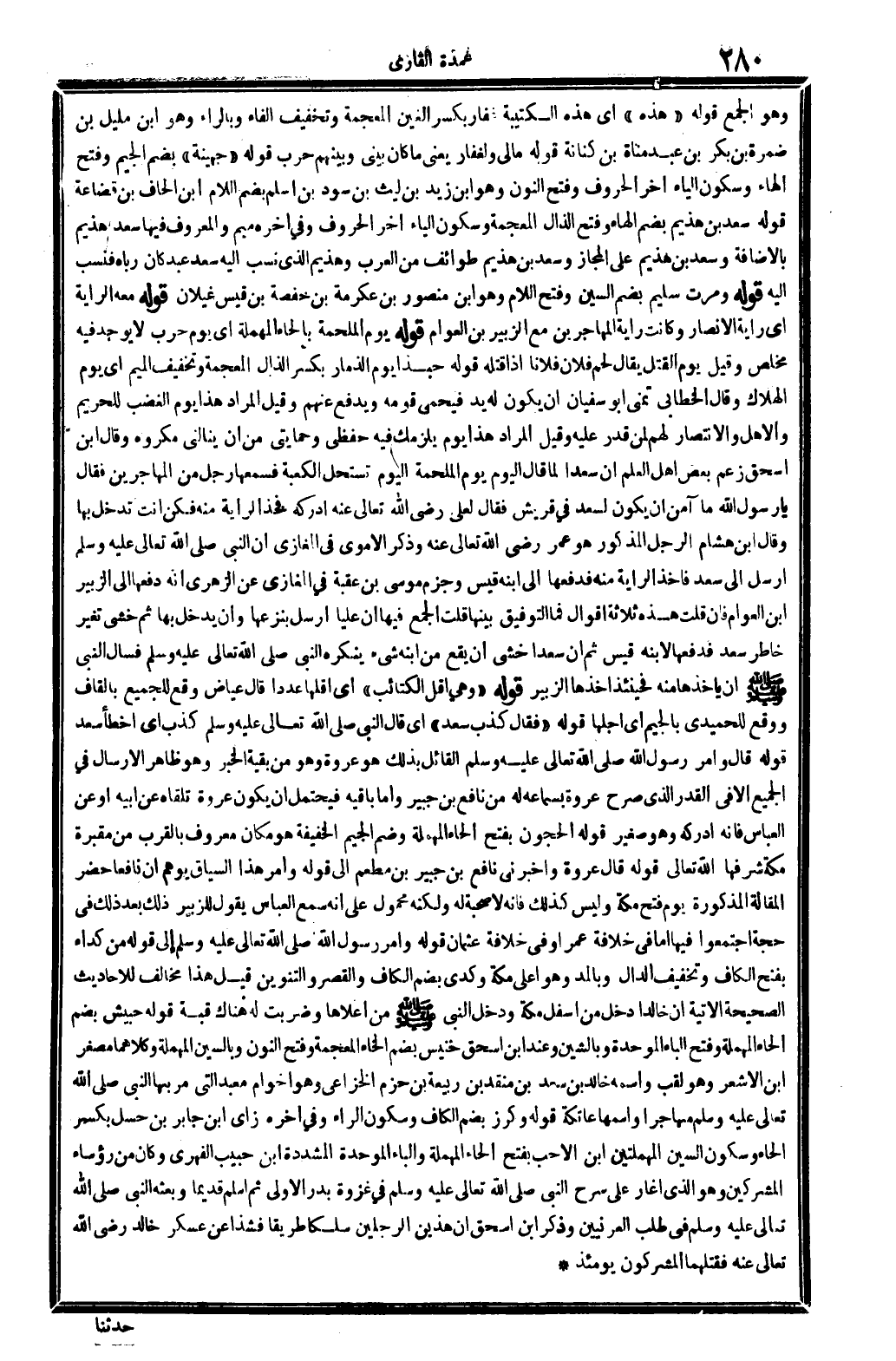 وَهُوَ الْجمع قَوْله " هَذِه " أَي هَذِه الكتيبة غفار بِكَسْر الْغَيْن الْمُعْجَمَة وَتَخْفِيف الْفَاء وبالراء وَهُوَ ابْن مليل بن ضَمرَة بن بكر بن عبد مَنَاة بن كنَانَة قَوْله مَالِي وَلِغفار يَعْنِي مَا كَانَ بيني وَبينهمْ حَرْب قَوْله " جُهَيْنَة " بِضَم الْجِيم وَفتح الْهَاء وَسُكُون الْيَاء آخر الْحُرُوف وَفتح النُّون وَهُوَ ابْن زيد بن لَيْث بن سود بن أسلم بِضَم اللَّام ابْن الحاف بن قضاعة قَوْله سعد بن هذيم بِضَم الْهَاء وَفتح الذَّال الْمُعْجَمَة وَسُكُون الْيَاء آخر الْحُرُوف وَفِي آخِره مِيم وَالْمَعْرُوف فِيهَا سعد هذيم بِالْإِضَافَة وَسعد بن هذيم على الْمجَاز وَسعد بن هذيم طوائف من الْعَرَب وهذيم الَّذِي نسب إِلَيْهِ سعد عبد كَانَ رباه فنسب إِلَيْهِ قَوْله وَمَرَّتْ سلم بِضَم السِّين وَفتح اللَّام وَهُوَ ابْن مَنْصُور بن عِكْرِمَة بن حَفْصَة بن قيس غيلَان قَوْله مَعَه الرَّايَة أَي راية الْأَنْصَار وَكَانَت راية الْمُهَاجِرين مَعَ الزبير بن الْعَوام قَوْله يَوْم الملحمة بِالْحَاء الْمُهْملَة أَي يَوْم حَرْب لَا يُوجد فِيهِ مخلص وَقيل يَوْم الْقَتْل يُقَال لحم فلَان فلَانا إِذا قَتله قَوْله حبذا يَوْم الذمار بِكَسْر الذَّال الْمُعْجَمَة وَتَخْفِيف الْمِيم أَي يَوْم الْهَلَاك وَقَالَ الْخطابِيّ تمنى أَبُو سُفْيَان أَن يكون لَهُ يَد فيحمي قومه وَيدْفَع عَنْهُم وَقيل المُرَاد هَذَا يَوْم الْغَضَب للحريم والأهل والانتصار لَهُم لمن قدر عَلَيْهِ وَقيل المُرَاد هَذَا يَوْم يلزمك فِيهِ حفظي وحمايتي من أَن ينالني مَكْرُوه وَقَالَ ابْن اسحق زعم بعض أهل الْعلم أَن سَعْدا لما قَالَ الْيَوْم يَوْم الملحمة الْيَوْم تستحل الْكَعْبَة فَسَمعَهَا رجل من الْمُهَاجِرين فَقَالَ يَا رَسُول الله مَا آمن أَن يكون لسعد فِي قُرَيْش فَقَالَ لعَلي رَضِي الله تَعَالَى عَنهُ أدْركهُ فَخذ الرَّايَة مِنْهُ فَكُن أَنْت تدخل بهَا وَقَالَ ابْن هِشَام الرجل الْمَذْكُور هُوَ عمر رَضِي الله تَعَالَى عَنهُ وَذكر الْأمَوِي فِي الْمَغَازِي أَن النَّبِي - صَلَّى اللَّهُ عَلَيْهِ وَسَلَّم َ - أرسل إِلَى سعد فَأخذ الرَّايَة مِنْهُ فَدَفعهَا إِلَى ابْنه قيس وَجزم مُوسَى بن عقبَة فِي الْمَغَازِي عَن الزُّهْرِيّ أَنه دَفعهَا إِلَى الزبير بن الْعَوام فَإِن قلت هَذِه ثَلَاثَة أَقْوَال فَمَا التَّوْفِيق بَينهَا قلت الْجمع فِيهَا أَن عليا أرسل بنزعها وَأَن يدْخل بهَا ثمَّ خشى تغير خاطر سعد فَدَفعهَا لِابْنِهِ قيس ثمَّ أَن سَعْدا خشِي أَن يَقع من ابْنه شَيْء يُنكره النَّبِي - صَلَّى اللَّهُ عَلَيْهِ وَسَلَّم َ - فَسَأَلَ النَّبِي - صَلَّى اللَّهُ عَلَيْهِ وَسَلَّم َ - أَن يَأْخُذهَا مِنْهُ فَحِينَئِذٍ أَخذهَا الزبير قَوْله " وَهِي أقل الْكَتَائِب " أَي أقلهَا عددا قَالَ عِيَاض وَقع للْجَمِيع بِالْقَافِ وَوَقع للحميدي بِالْجِيم أَي أجلهَا قَوْله " فَقَالَ كذب سعد " أَي قَالَ النَّبِي - صَلَّى اللَّهُ عَلَيْهِ وَسَلَّم َ - كذب أَي أَخطَأ سعد قَوْله قَالَ وَأمر رَسُول الله - صَلَّى اللَّهُ عَلَيْهِ وَسَلَّم َ - الْقَائِل بذلك هُوَ عُرْوَة وَهُوَ من بَقِيَّة الْخَبَر وَهُوَ ظَاهر الْإِرْسَال فِي الْجَمِيع إِلَّا فِي الْقدر الَّذِي صرح عُرْوَة بِسَمَاعِهِ لَهُ من نَافِع بن جُبَير وَأما بَاقِيه فَيحْتَمل أَن يكون عُرْوَة تَلقاهُ عَن أَبِيه أَو عَن الْعَبَّاس فَإِنَّهُ أدْركهُ وَهُوَ صَغِير قَوْله الْحجُون بِفَتْح الْحَاء الْمُهْملَة وَضم الْجِيم الْخَفِيفَة هُوَ مَكَان مَعْرُوف بِالْقربِ من مَقْبرَة مَكَّة شرفها الله تَعَالَى قَوْله قَالَ عُرْوَة وَأَخْبرنِي نَافِع بن جُبَير بن مطعم إِلَى قَوْله وَأمر هَذَا السِّيَاق يُوهم أَن نَافِعًا أحضر الْمقَالة الْمَذْكُورَة يَوْم فتح مَكَّة وَلَيْسَ كَذَلِك فَإِنَّهُ لَا صُحْبَة لَهُ وَلكنه مَحْمُول على أَن
