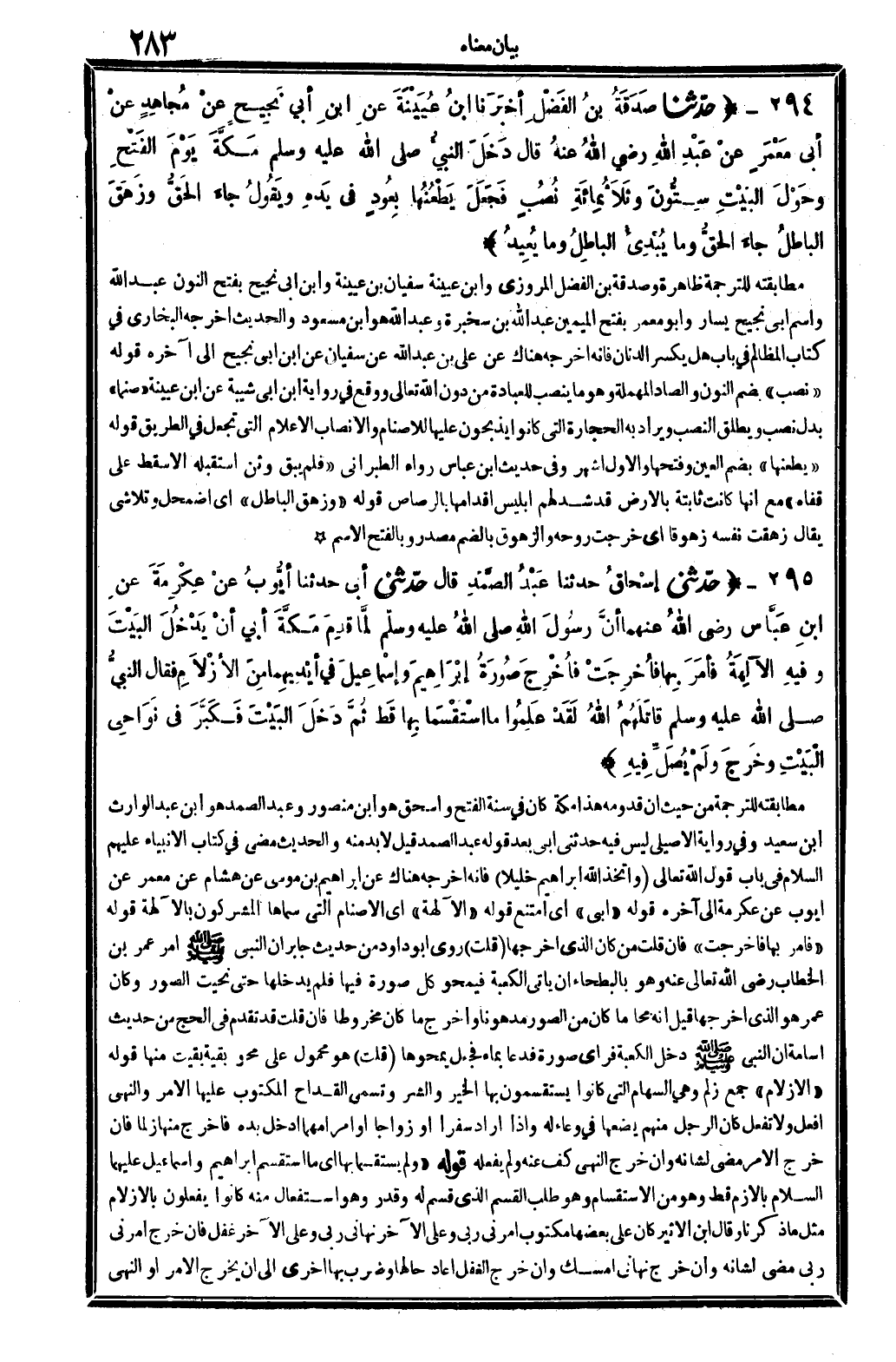 4287 - حدَّثنا صَدَقَةُ بنُ الفَضْلِ أخبَرَنا ابنُ عُيَيْنَةَ عنِ ابنِ أبي نَجِيحٍ عنْ مُجاهِدٍ عنْ أبي مَعْمَرٍ عنْ عَبْدِ الله رَضِي الله عنهُ قَالَ دَخَلَ النبيُّ صلى الله عَلَيْهِ وَسلم مَكَّةَ يَوْمَ الفَتْحِ وحَوْلَ البَيْتِ سِتُّونَ وثَلاَثُمَائَةِ نُصُبٍ فَجَعَلَ يَطْعُنُها بِعُودٍ فِي يَدِهِ وَيَقُولُ جاءَ الحَقُّ وزَهَقَ الباطلُ جاءَ الحقُّ وَمَا يُبْدِىءُ الباطِلُ وَمَا يُعِيدُ. .