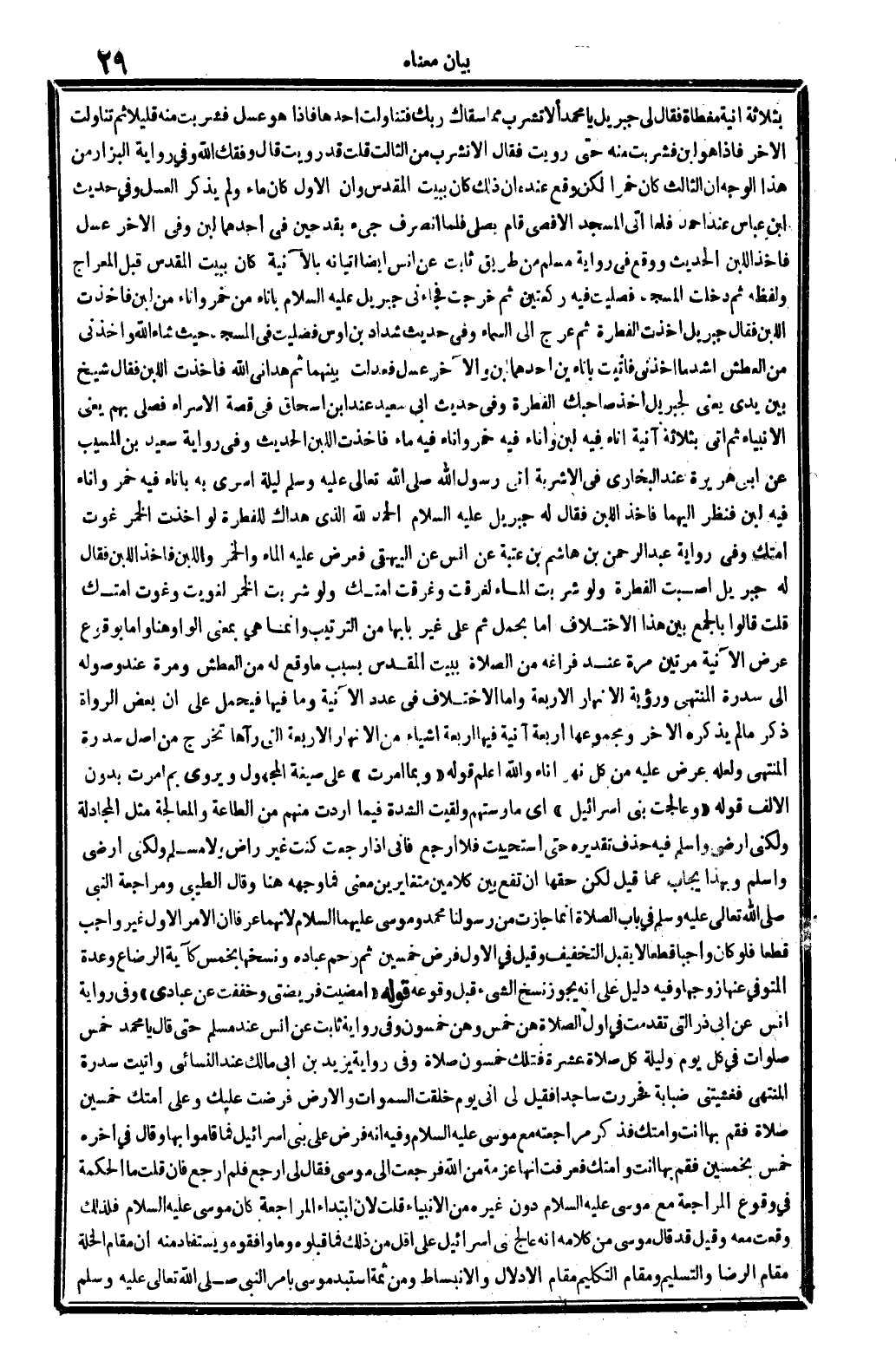 بِثَلَاثَة آنِية مغطاة، فَقَالَ لي جِبْرِيل: يَا مُحَمَّد أَلاَ تَشرب مِمَّا سقاك رَبك؟ فتناولت أَحدهَا فَإِذا هُوَ عسل، فَشَرِبت مِنْهُ قَلِيلا ثمَّ تناولت الآخر فَإِذا هُوَ لبن فَشَرِبت مِنْهُ حَتَّى رويت، فَقَالَ: أَلا تشرب من الثَّالِث؟ قلت: قد رويت. قَالَ: وفقك الله، وَفِي رِوَايَة الْبَزَّار من هَذَا الْوَجْه: أَن الثَّالِث كَانَ خمرًا، لَكِن وَقع عِنْده أَن ذَلِك كَانَ بِبَيْت الْمُقَدّس، وَأَن الأول كَانَ مَاء وَلم يذكر الْعَسَل. وَفِي حَدِيث ابْن عَبَّاس عِنْد أَحْمد: فَلَمَّا أَتَى الْمَسْجِد الْأَقْصَى قَامَ يُصَلِّي، فَلَمَّا انْصَرف جِيءَ بقدحين فِي أَحدهمَا لبن وَفِي الآخر عسل، فَأخذ اللَّبن ... الحَدِيث، وَوَقع فِي رِوَايَة مُسلم من طَرِيق ثَابت عَن أنس أَيْضا إِتْيَانه بالآنية كَانَ بِبَيْت الْمُقَدّس قبل الْمِعْرَاج وَلَفظه: ثمَّ دخلت الْمَسْجِد فَصليت فِيهِ رَكْعَتَيْنِ ثمَّ خرجت فَجَاءَنِي جِبْرِيل، عَلَيْهِ الصَّلَاة وَالسَّلَام، بِإِنَاء من خمر وإناء من لبن، فَأخذت اللَّبن، فَقَالَ جِبْرِيل: أخذت الْفطْرَة، ثمَّ عرج إِلَى السَّمَاء، وَفِي حَدِيث شَدَّاد بن أَوْس: فَصليت فِي الْمَسْجِد حَيْثُ شَاءَ الله وأخذني من الْعَطش أَشد مَا أَخَذَنِي، فَأتيت بإناءين أَحدهمَا لبن وَالْآخر عسل، فعدلت بَينهمَا، ثمَّ هَدَانِي الله فَأخذت اللَّبن، فَقَالَ شيخ بَين يَدي، يَعْنِي لجبريل: أَخذ صَاحبك الْفطْرَة، وَفِي حَدِيث أبي سعيد عِنْد إِبْنِ إِسْحَاق فِي قصَّة الْإِسْرَاء: فصلى بهم، يَعْنِي الْأَنْبِيَاء، ثمَّ أَتَى بِثَلَاثَة آنِية: إِنَاء فِيهِ لبن وإناء فِيهِ خمر وإناء فِيهِ مَاء فَأخذت اللَّبن ... الحَدِيث. وَفِي رِوَايَة سعيد بن الْمسيب عَن أبي هُرَيْرَة عِنْد البُخَارِيّ فِي الْأَشْرِبَة: أَتَى رَسُول الله، صلى الله عَلَيْهِ وَسلم، لَيْلَة أسرِي بِهِ بِإِنَاء فِيهِ خمر وإناء فِيهِ لبن، فَنظر إِلَيْهِمَا فَأخذ اللَّبن، فَقَالَ لَهُ جِبْرِيل، عَلَيْهِ الصَّلَاة وَالسَّلَام: الْحَمد لله الَّذِي هداك للفطرة، لَو أخذت الْخمر غوت أمتك، وَفِي رِوَايَة عبد الرَّحْمَن بن هَاشم بن عتبَة عَن أنس عَن الْبَيْهَقِيّ: فَعرض عَلَيْهِ المَاء وَالْخمر وَاللَّبن فَأخذ اللَّبن، فَقَالَ لَهُ جِبْرِيل: أصبت الْفطْرَة، وَلَو شربت المَاء لغرقت وغرقت أمتك، وَلَو شربت الْخمر لغويت وغوت أمتك، قلت: قَالُوا بِالْجمعِ بَين هَذَا الِاخْتِلَاف إِمَّا بِحمْل: ثمَّ، على غير بَابهَا من التَّرْتِيب، وَإِنَّمَا هِيَ بِمَعْنى الْوَاو هُنَا، وَأما بِوُقُوع عرض الْآنِية مرَّتَيْنِ: مرّة عِنْد فَرَاغه من الصَّلَاة بِبَيْت الْمُقَدّس بِسَبَب مَا وَقع لَهُ من الْعَطش، وَمرَّة عِنْد وُصُوله إِلَى سِدْرَة الْمُنْتَهى ورؤية الْأَنْهَار الْأَرْبَعَة، وَأما الِاخْتِلَاف فِي عدد الْآنِية وَمَا فِيهَا فَيحمل على أَن بعض الروَاة ذكر مَا لم يذكرهُ الآخر ومجموعها أَرْبَعَة آنِية فِيهَا أَرْبَعَة أَشْيَاء من الْأَنْهَار الْأَرْبَعَة الَّتِي رَآهَا تخرج من أصل سِدْرَة الْمُنْتَهى، وَلَعَلَّه عرض عَلَيْهِ من كل نهر إِنَاء، وَالله أعلم.