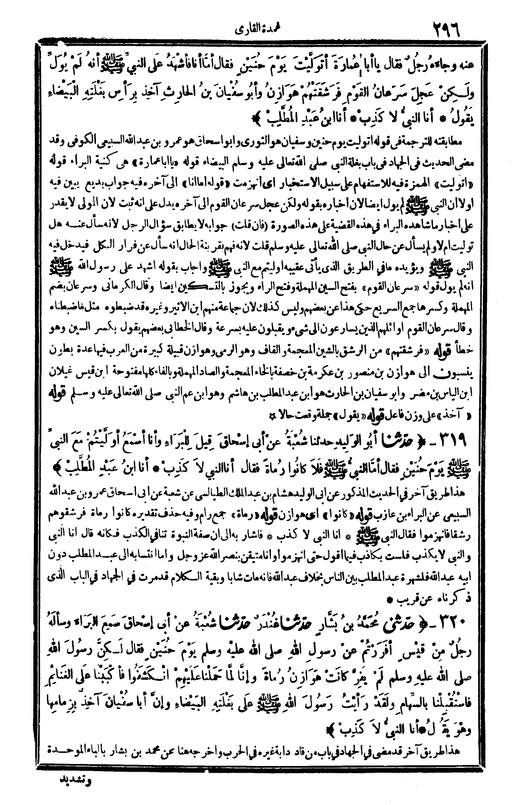 4316 - حدَّثنا أبُو الوَلِيدِ حدّثنا شُعْبَةُ عَنْ أبي إسْحاقَ قِيلَ لِ لْبَرَاءِ وَأَنا أسْمَعُ أوَلَّيْتُمْ مَعَ النبيِّ صلى الله عَلَيْهِ وَسلم يَوْمَ حُنَيْنٍ فَقَالَ أمَّا النبيُّ صلى الله عَلَيْهِ وَسلم فَلاَ كانُوا رُماةً فَقَالَ: